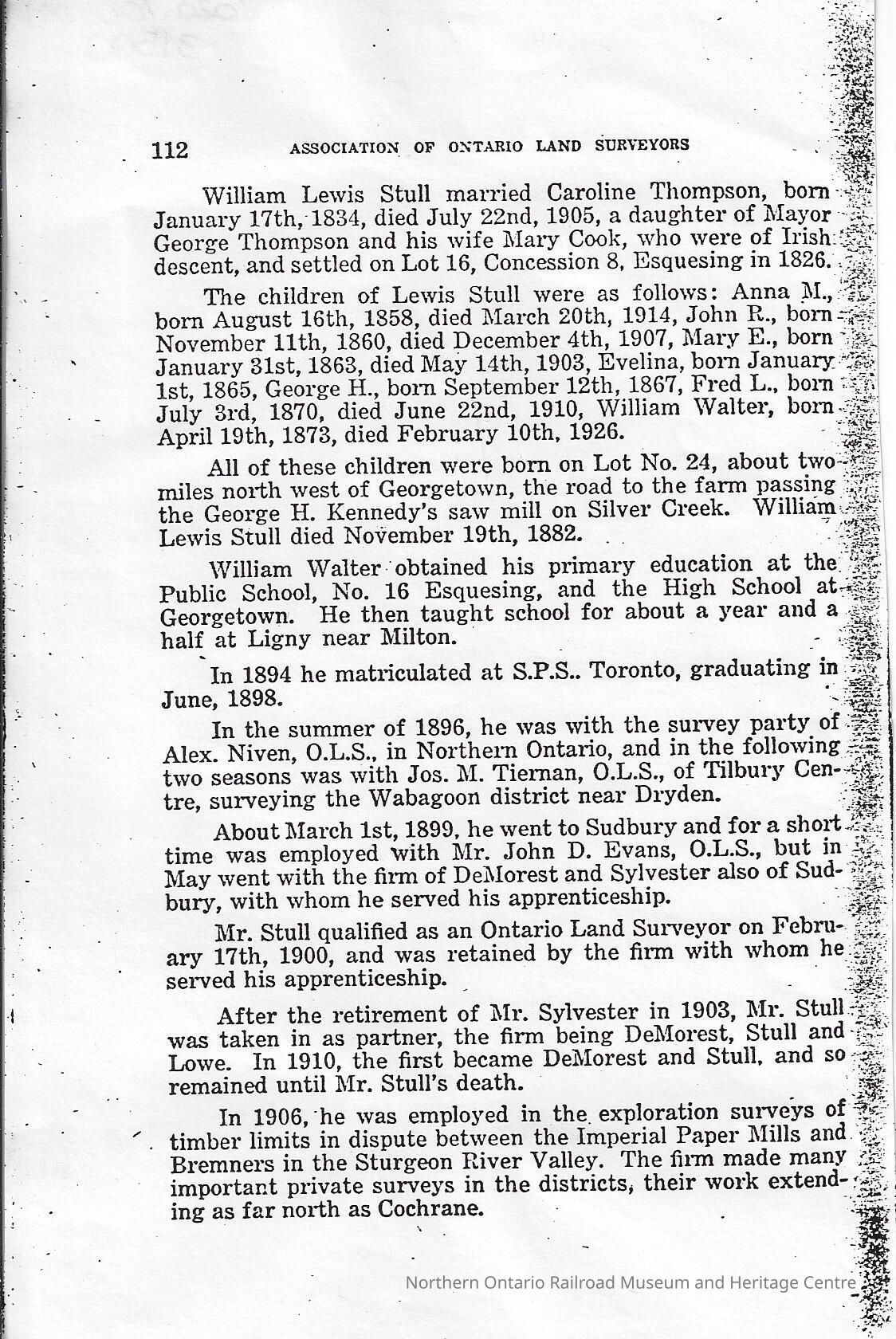 William Walter Stull was born on April 19th, 1873 and died on February 10th, 1926. During the summer of 1896 he was working with a survey party led by Alex Niven of the Ontario Land Surveyors in Northern Ontario, and in 1899 he went to Sudbury Ontario to work as an apprentice surveyor, originally for John D. Evans, but later with the DeMorest and Sylvester Firm. By 1900 he was qualified to become an Ontario Land Surveyor and continued to work for DeMorest and Sylvester, in 1903 he became partner of the firm. By 1901, Stull married Carrie Carley, a sister of Mrs. DeMorest, the two had five children: Ted, Wildred, Kathleen, Elizabeth, and Eric.