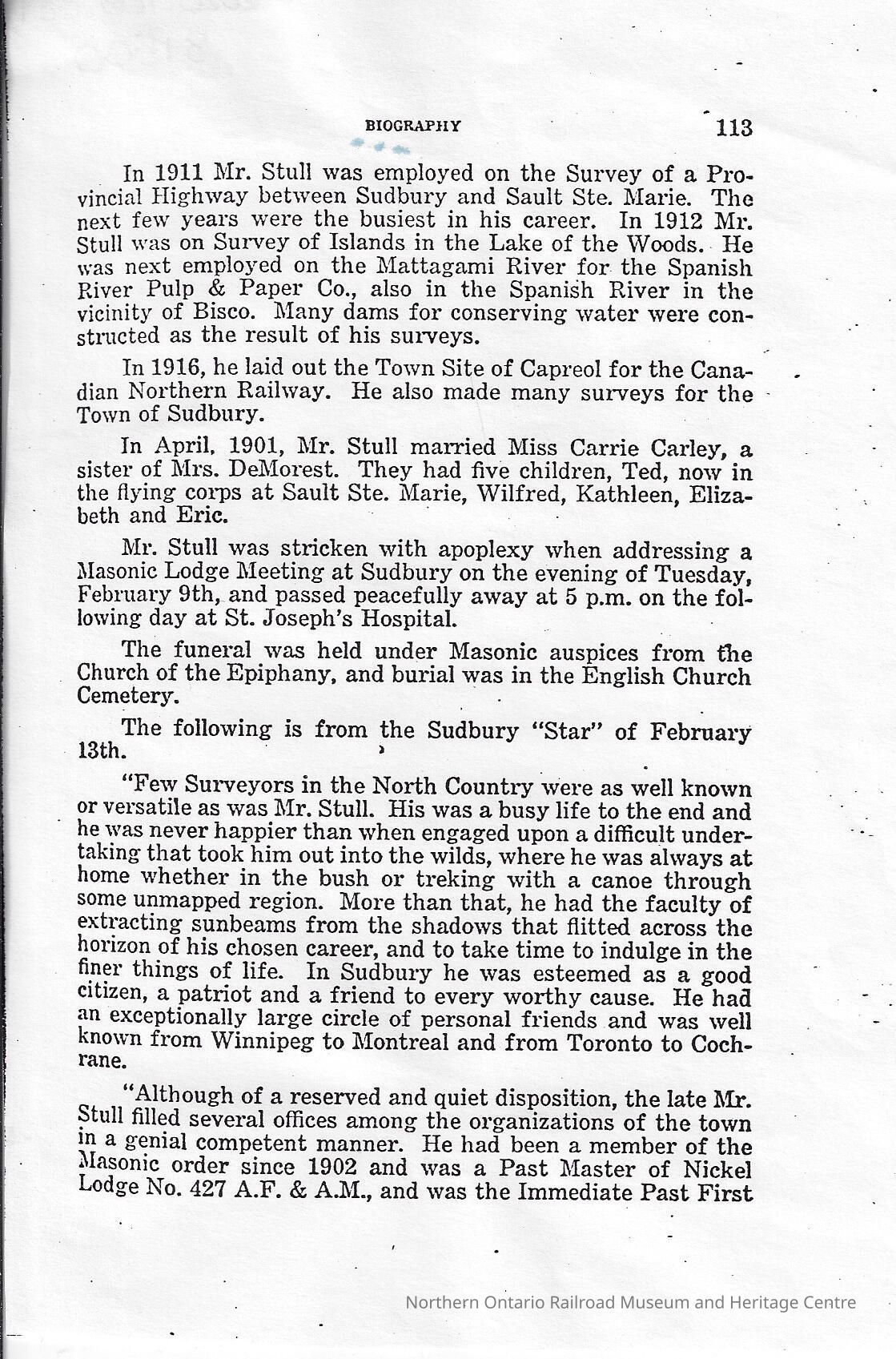 In 1916, Stull was responsible for laying out the Town Site of Capreol for the Canadian Northern Railway, among doing other large surveys for the then Town of Sudbury.