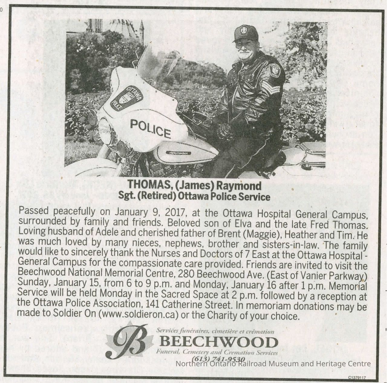 Obituary of Ray Thomas in the Ottawa Citizen, January 14, 2017Collection