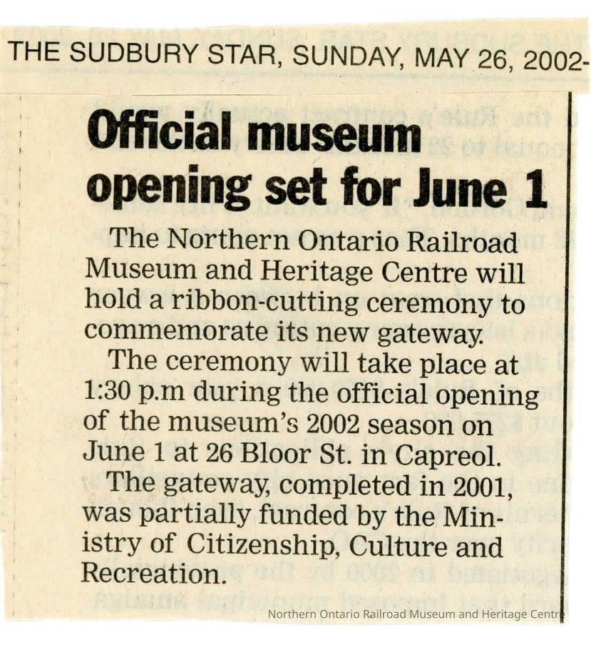"Official museum opening set for June 1" in The Sudbury Star, 26 May 2002. Outlines the opening of the new gateway at NORMHC.Collection