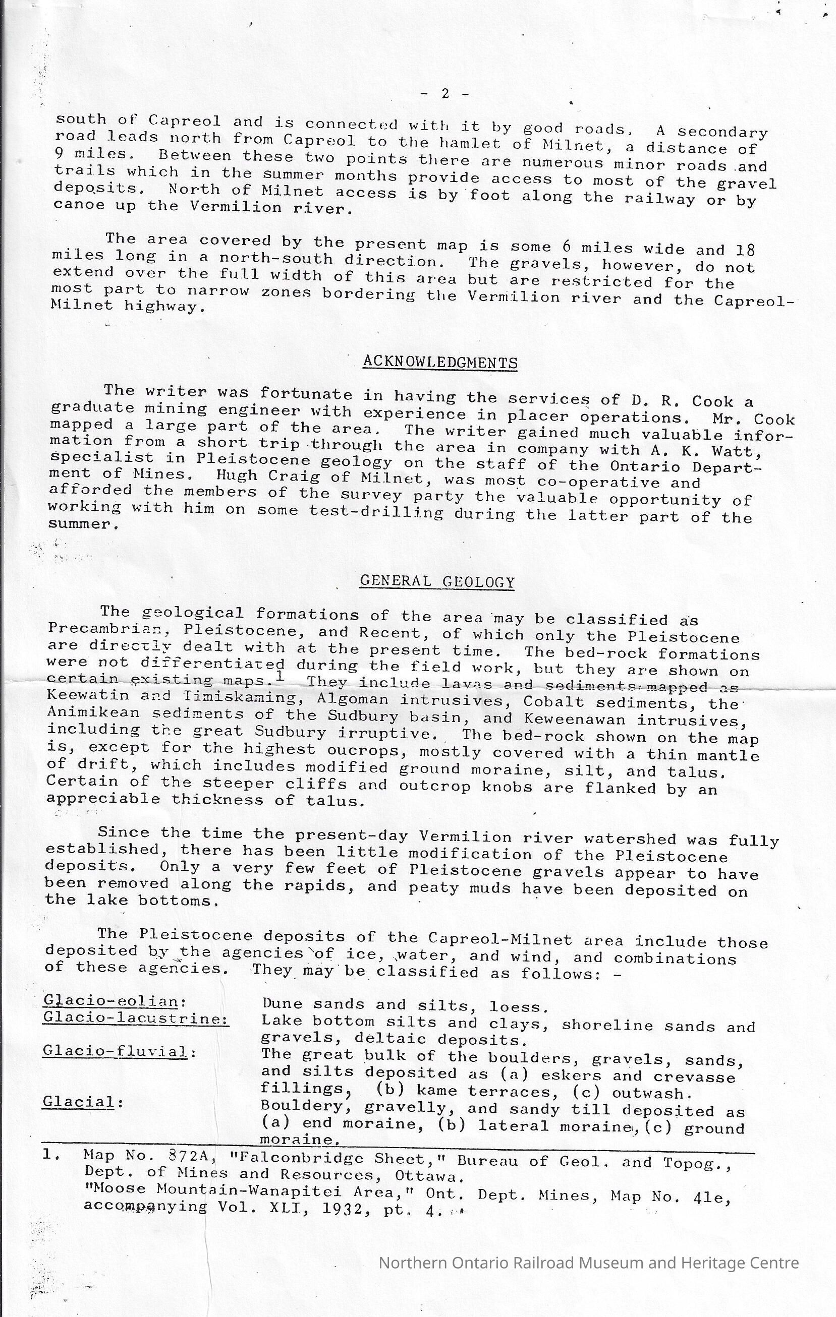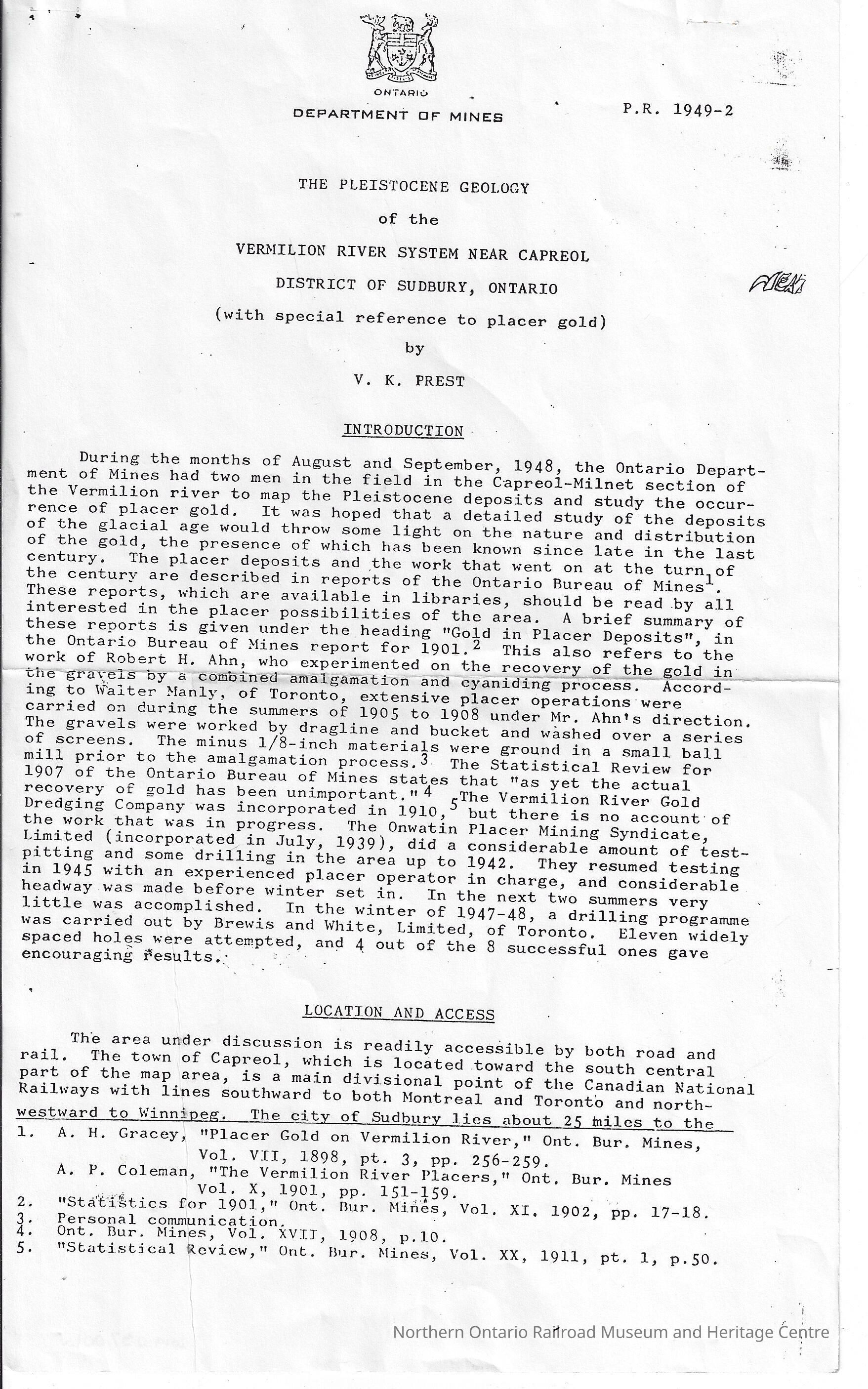 Ontario Department of Mines: The Pleistocene Geology of the Vermillion River System Near Capreol District of Sudbury, Ontario (with special reference to placer gold)Entry/Object ID