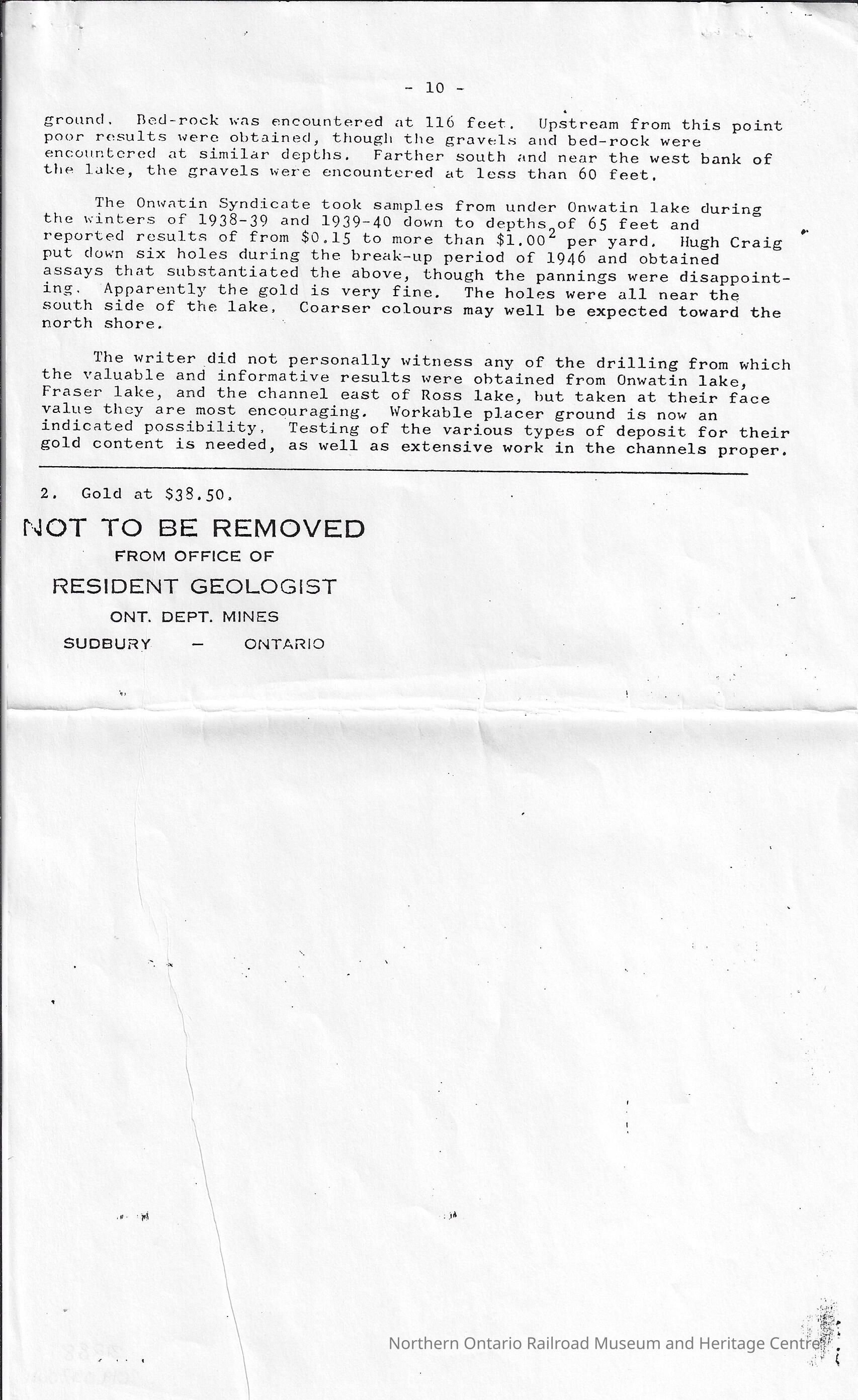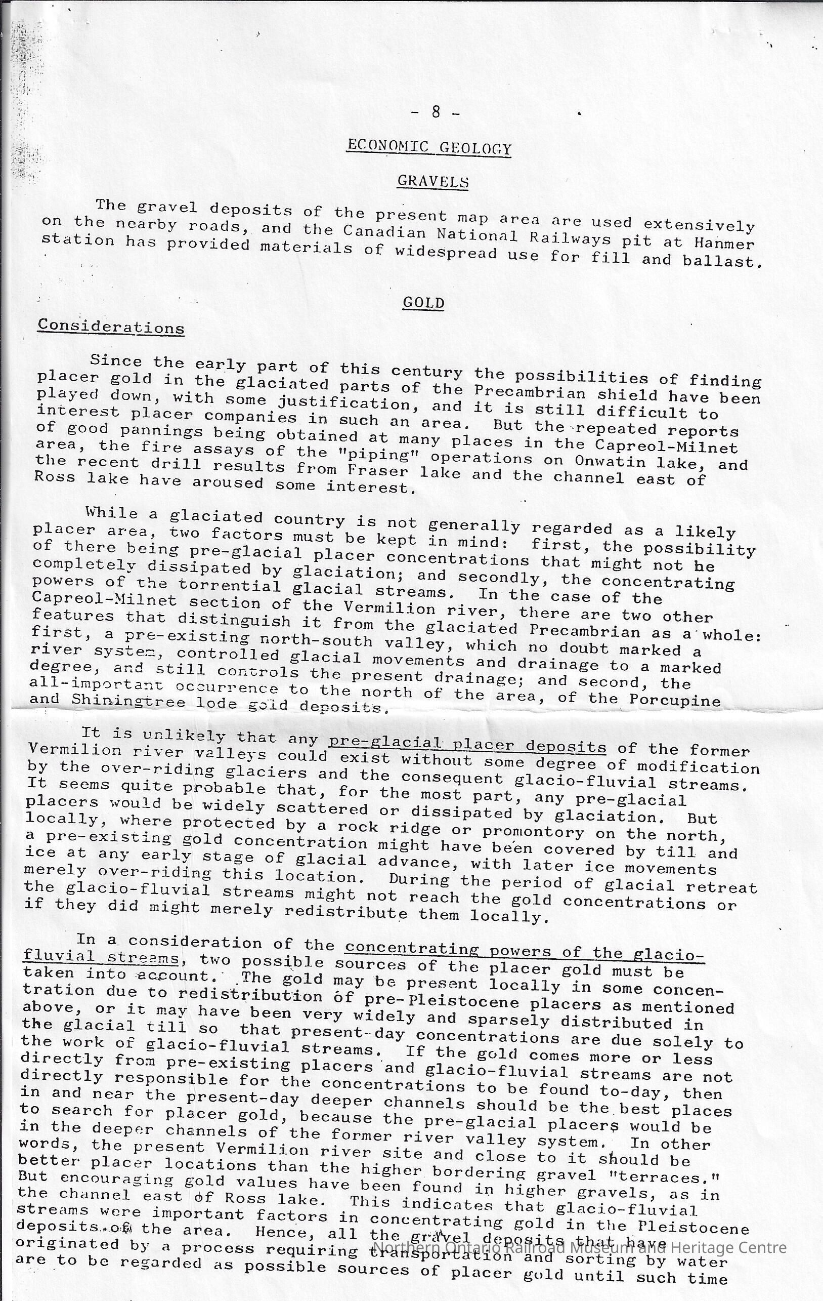 The article includes a summary of reports from the 1901 Ontario Bureau of Mines Report, "Gold in Placer Deposits", referring to the works of Robert H. Ahn and Walter Manly. 9 pages in total, type written with black ink on legal sized white paper. Page 7 is missingCollection
