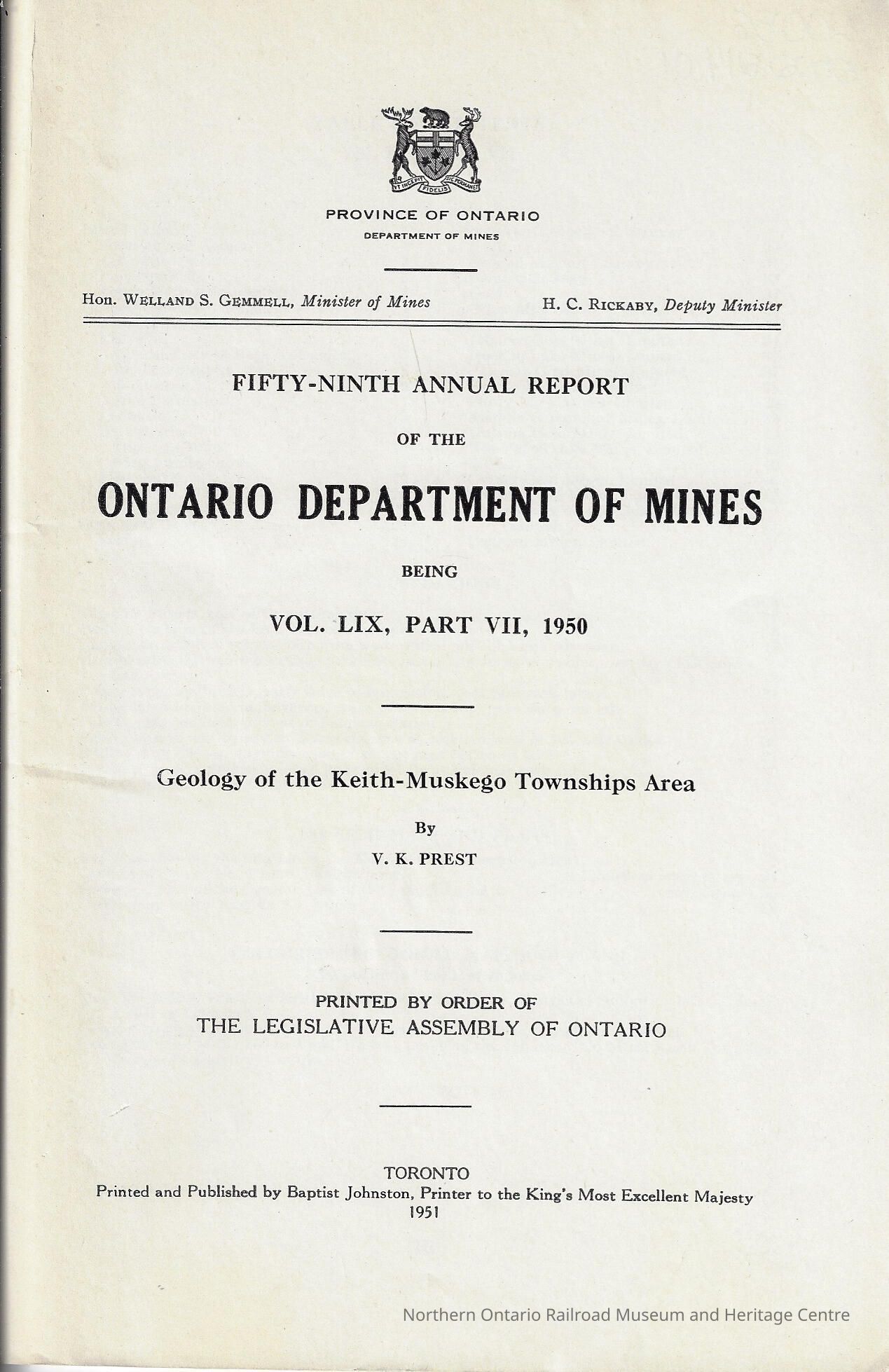 Book, report by the Ontario Department of Mines on the Keith Township and the Muskego Township.Context
