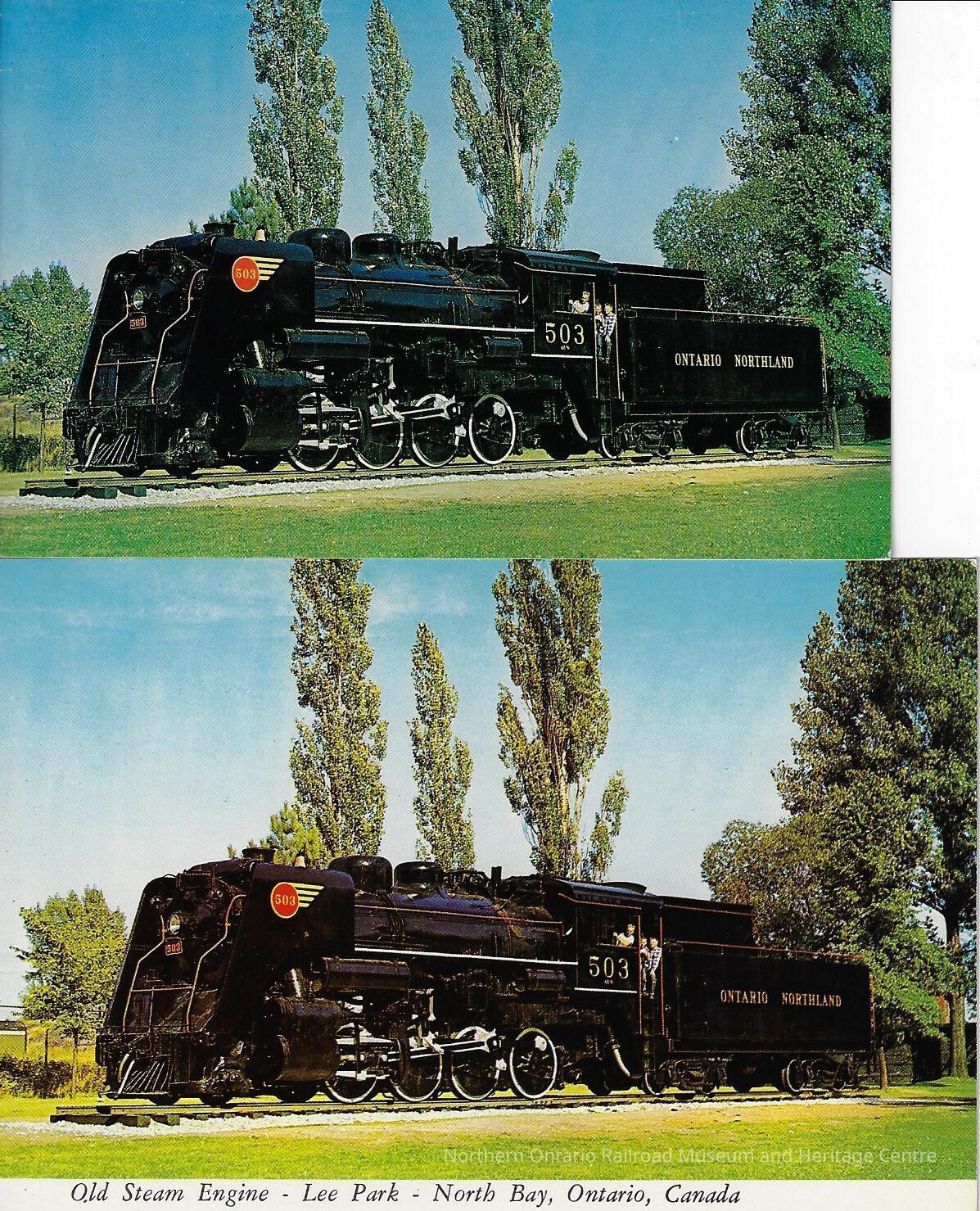 Two copies of an Ontario Northland Railway postcard showing an old steam engine in Lee Park, North Bay ON. The image shows the engine parked in the park with three children playing on it.