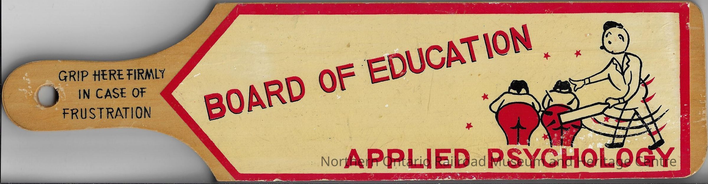 Wooden paddle with an image of a teacher spanking two students who are bent over.