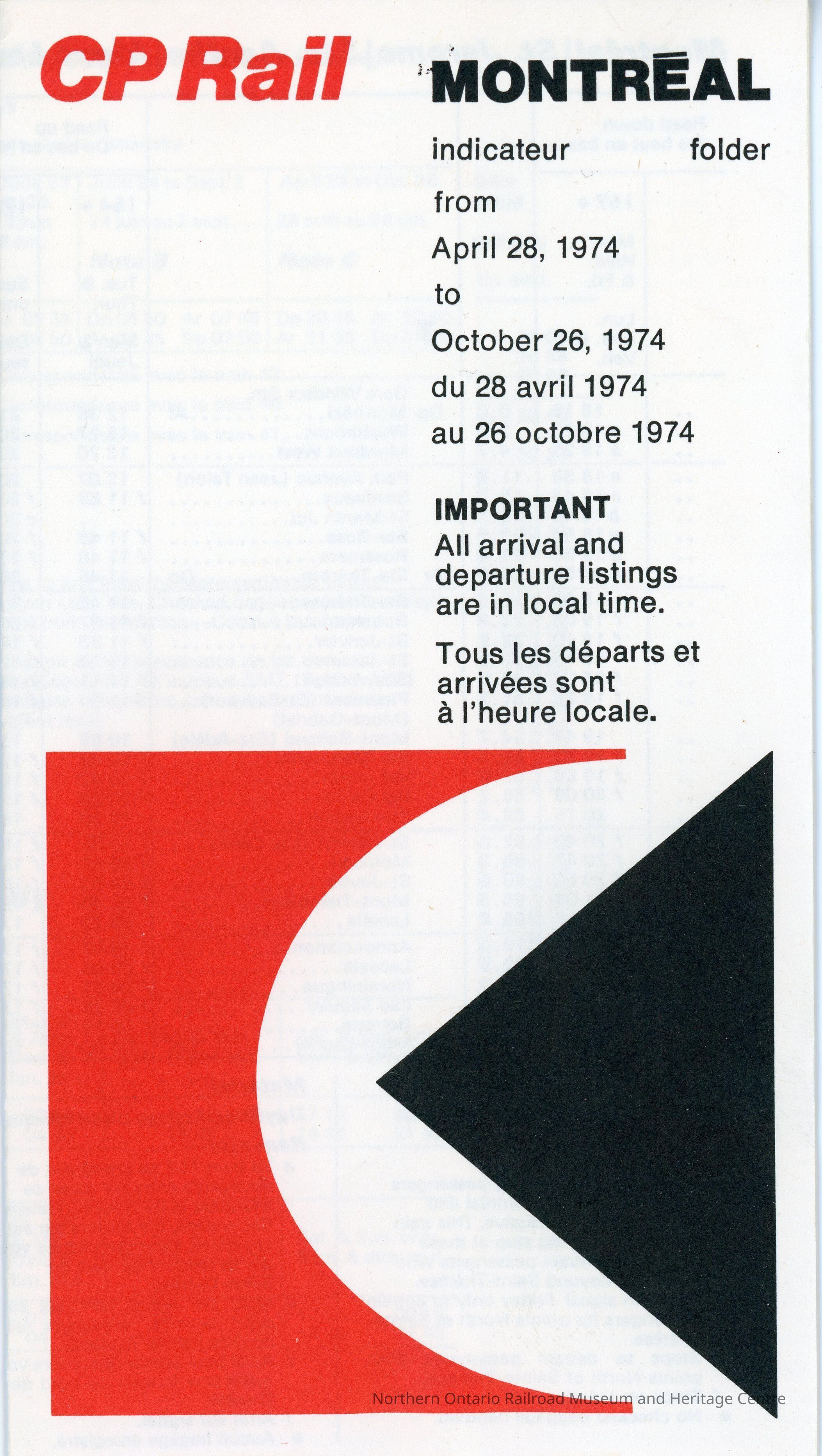 Passenger Schedule, CP Rail, Montreal, April 28th 1974 to October 26th 1974.Collection