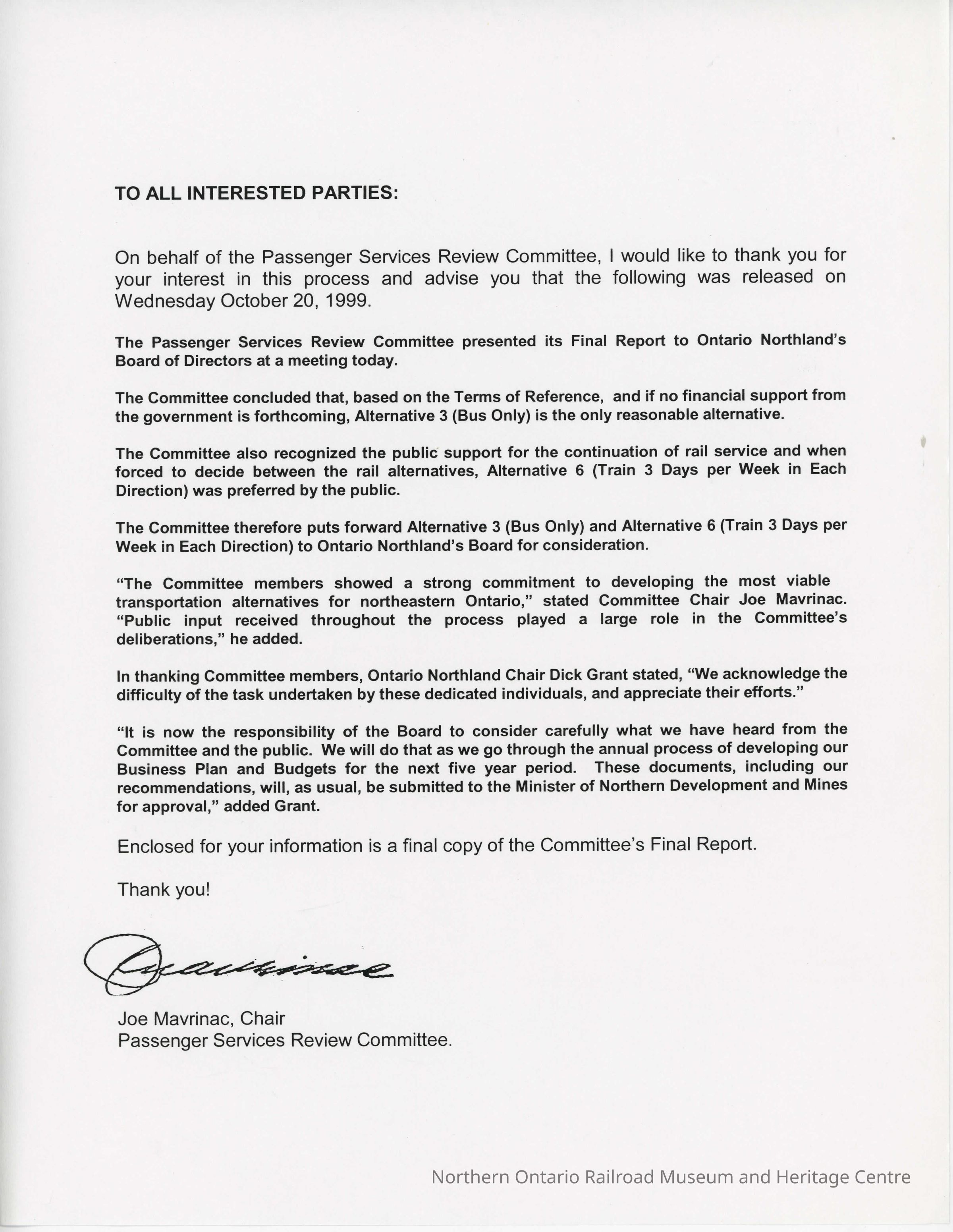 Passenger Services Review Committee Final Report to ONR, RE:Continuation of Rail Service, October 20, 1999Collection