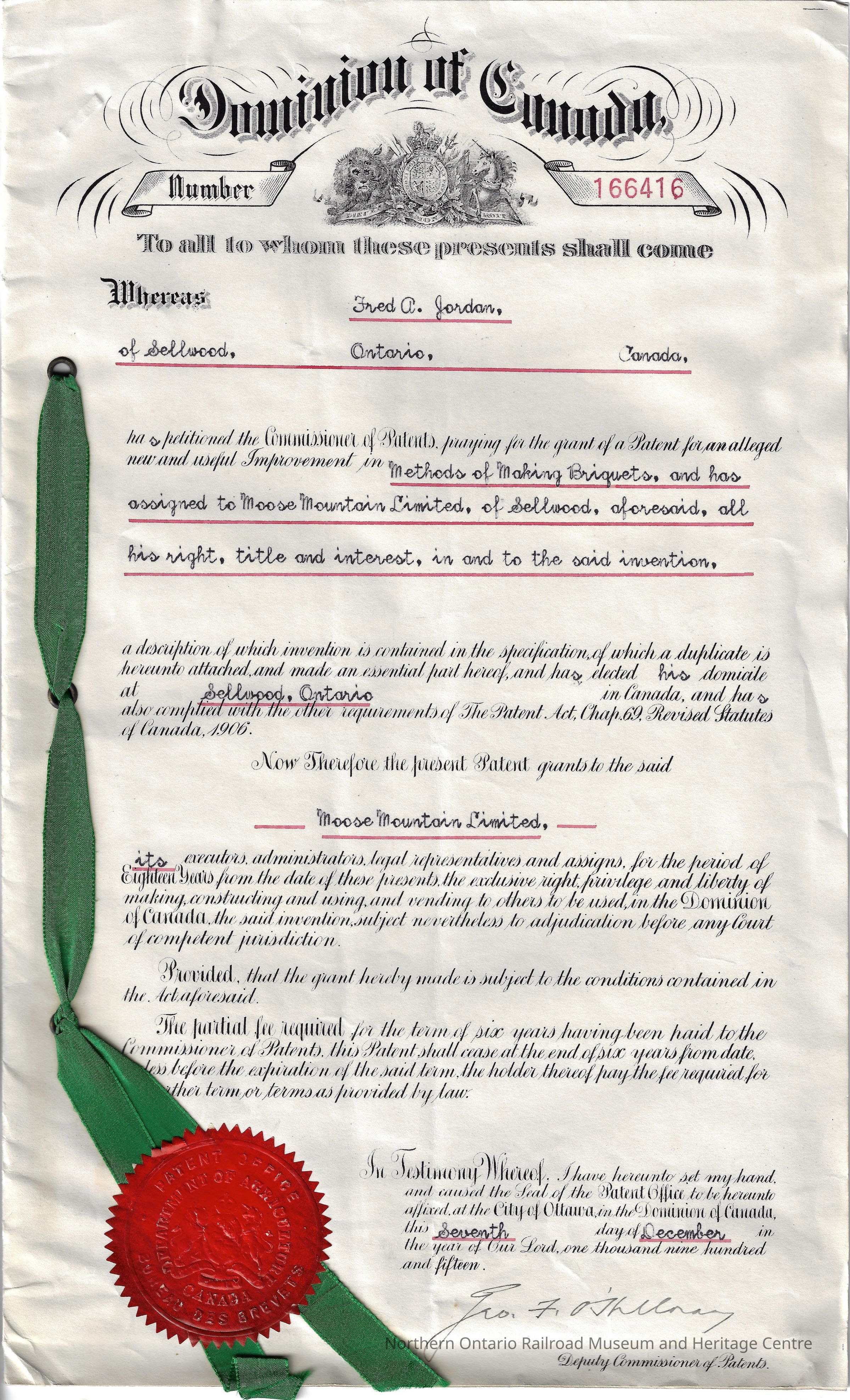 Patent grants from the Dominion of Canada Patent Office granting the Patents for Fred A. Jordan's "improvements in the methods of making briquets" to Moose Mountain Limited. No. 166416. The documents include ten pages of description from Fred A. Jordan of his invention, and one page of accompanying technical drawings. The description is signed by Fred A. Jordan and witnesses Arthur F. Williamsby and William F. Day in Sellwood, Ontario, Canada on April 27th 1914. The drawings are signed by Inventor Fred A. Jordan, Attorneys Edwards, Sager and Wooster, and Witnesses J.D. Conelly Jr. and M.G. McClelland in New York, NY on May 7th 1914. On the inner back cover is printed an extract from the Patent Act, Chap. 69, Revised Statutes of Canada, 1906. There are thirteen sheets in total counting the front and back cover, bound together with a green ribbon, and there is a official seal of the Patent Office of Canada, with the British coat of arms in the centre, at the bottom left corner of the front cover. The British coat of arms is also printed in black and white and centered at the top of front cover, underneath a "Dominion of Canada" banner. There is also a decorative border framing the text on the front cover. The rear cover is blank. There is a letter from Edwards, Sager and Wooster addressed to Moose Mountain Ltd., regarding the attached patent, December 17, 1915.Collection