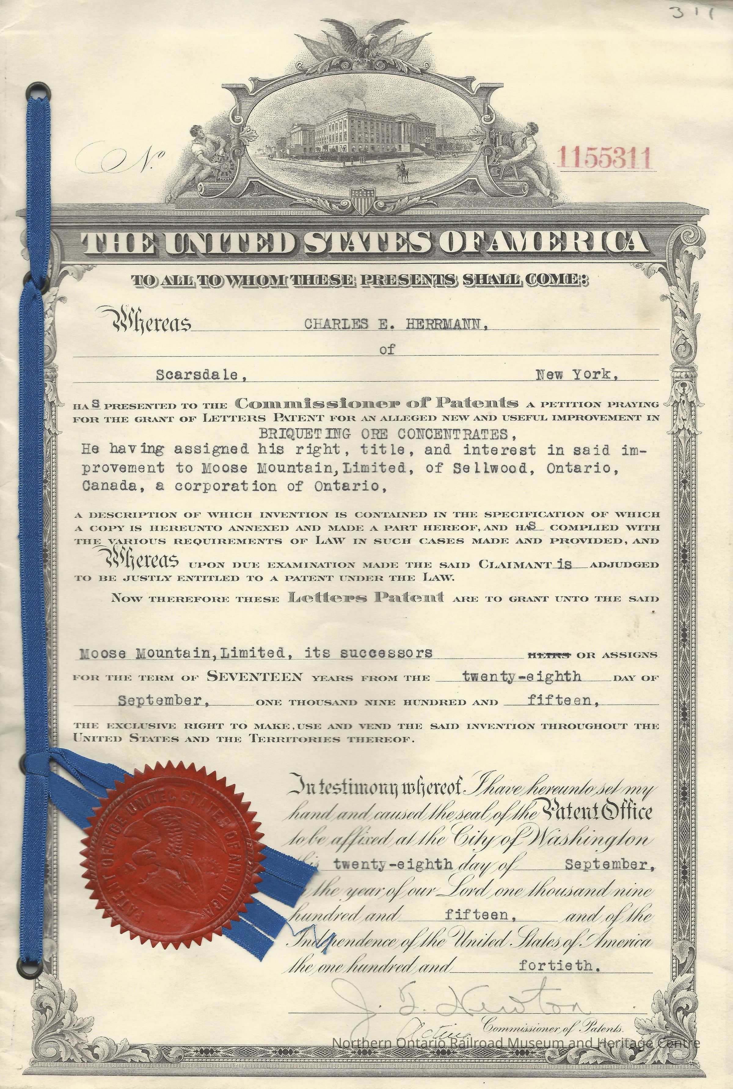 Patent Documents for Charles E. Herrmann's (of Scarsdale, New York USA)petition to the Commissioner of Patents of the United States Patent Office for Letters Patent for "new and useful improvements in briqueting ore concentrates. Patent no. 1155311. The petition includes a clause stating that the Letters Patent are to grant Moose Mountain Limited of Sellwood, Ontario, Canada and its successors exclusive rights to "make, use, and vend said invention". The petition was signed and sealed by J.T. Newton, Acting Commissioner of Patents, on the 28th of September, 1915. The document contains four pages with technical drawings of the invention, and a specification (three and a quarter pages long) from Charles E. Herrmann describing his improvements for briqueting ore concentrates, signed by witnesses W.H. Allyn and E. Bradford. The sheets are bound together with a blue ribbon, and there is an official United States Patent Office seal (red, with the image of an eagle with wings spread in the centre) on the bottom left corner of the front cover. There is a black and white image of the Patent Office centered at the top of the front cover, inside an ornate frame. At the top of the frame is an eagle with wings spread, to the left and right there is a seated man, turned to face the patent office. At the bottom of the frame is the United State of America flag, inside a shield. The rear cover is blank.Context