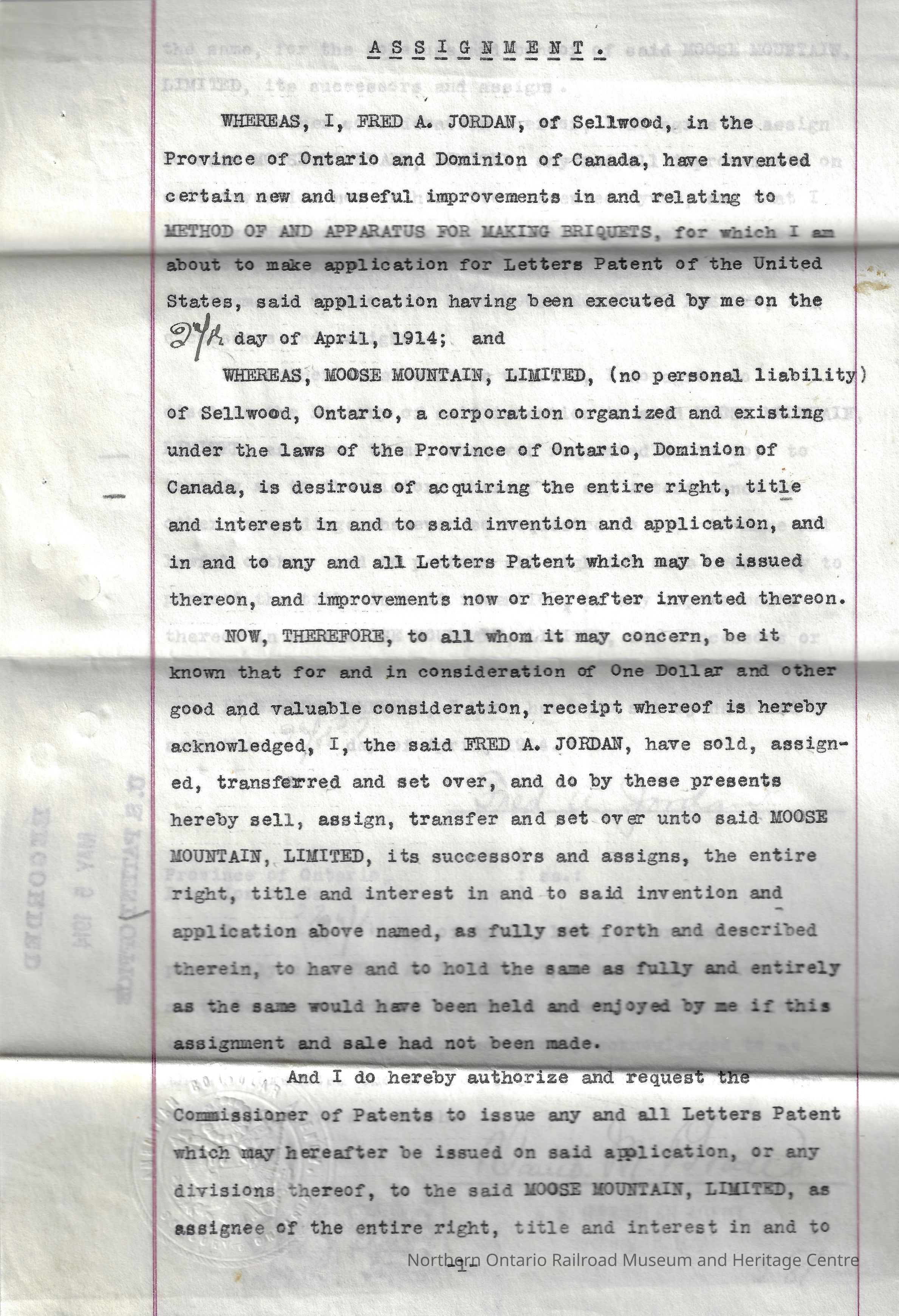 Transfer of Patent from Fred A. Jordan to Moose Mountain Ltd., signed on April 27th 1914 in Sellwood, Ontario, by Fred A. Jordan and David M. Brodet U.S. Consular Agent, Sudbury, B.N.A). There are two official watermark of the US Consular Agent for Sudbury Ontario affixed beside David M. Brodet's signature, along with two American Consular Agency "1 dollar fee" stamps. The documents are attached to a blue paper sleeve with a blue ribbon. There are words stamped in blue ink on the outside of the sleeve " Recorded May 5 1914 U.S. Patent Office" and stamped in black ink " 98346. Also, handwritten in pencil, " Edwards, Sager, and Wooster, 2 Rector St. New York, N.Y. Fee $2.