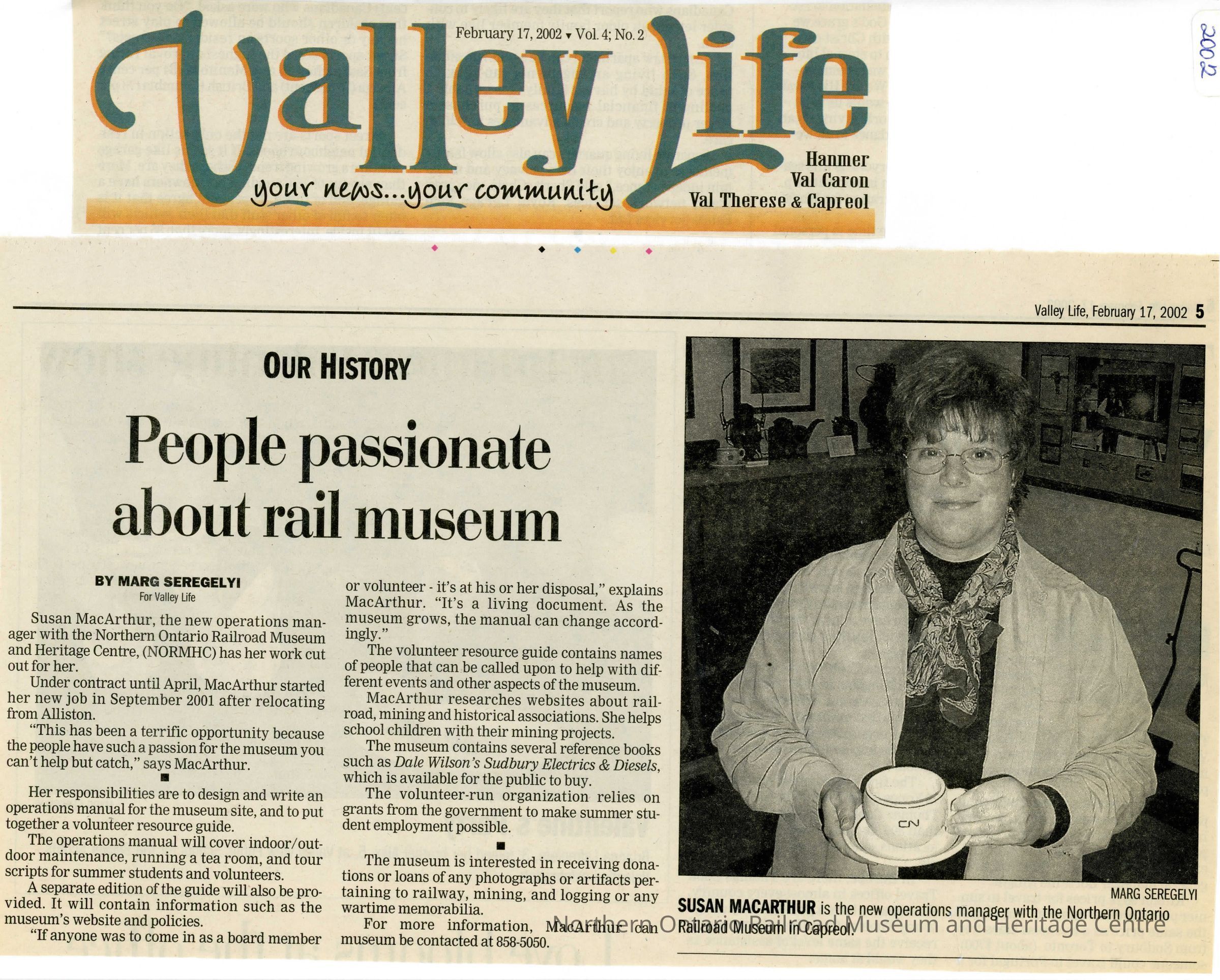 "People passionate about rail museum" In Valley Life, February 17, 2002 by Marg Seregelyi. Features Susan McArthur, new operation manager at NORMHC and design of NORMHC reference materials.Collection