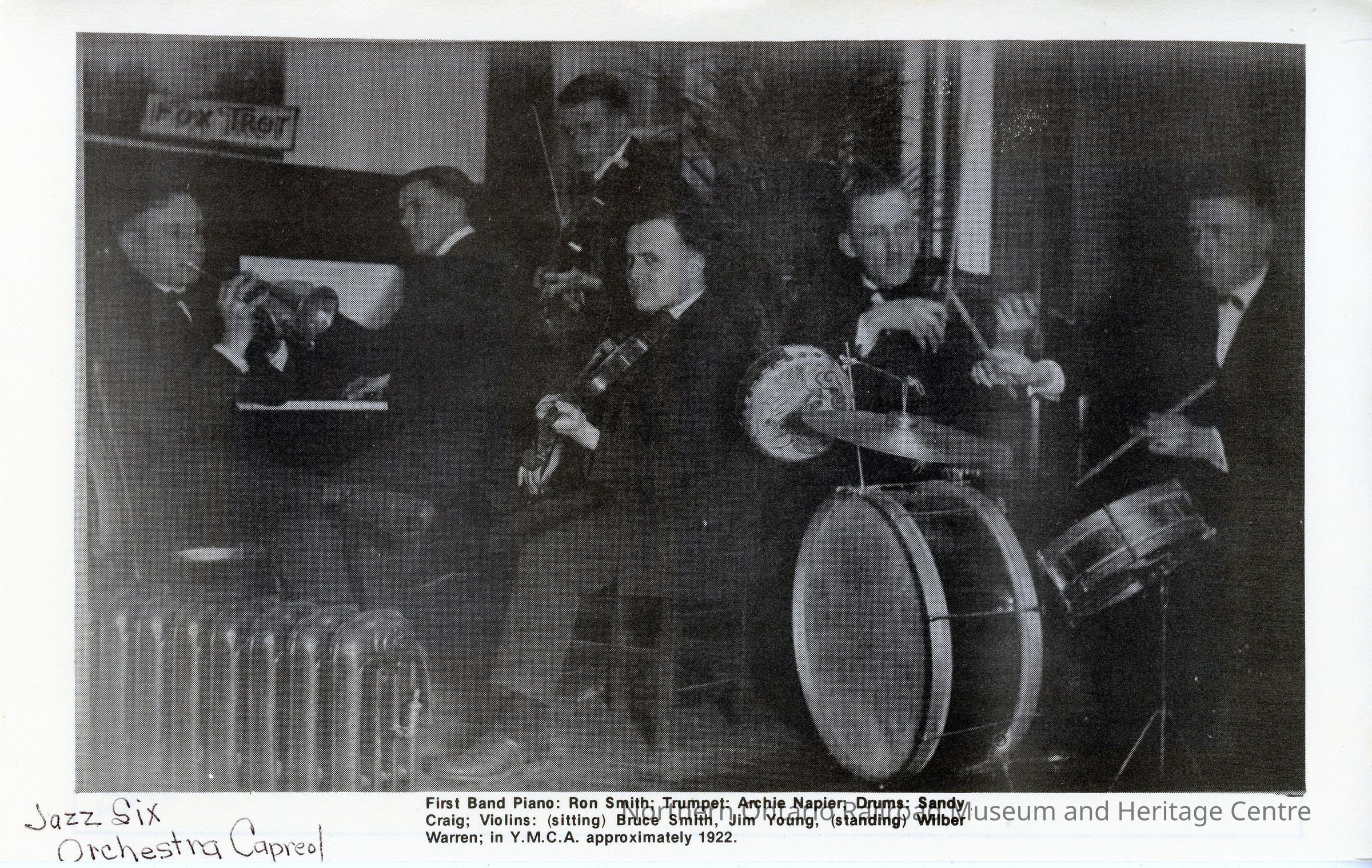 "First Band Piano: Ron Smith; Trumpet: Archie Napier; Drums: Sandy Craig; Violins (Sitting): Bruce Smith, Jim Young, (Standing) Wilber Warren; in YMCA approx. 1922Collection