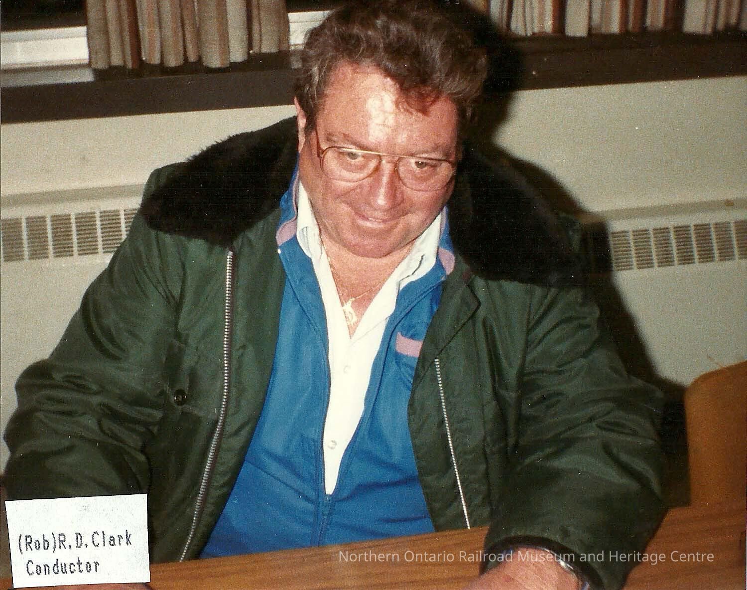 Coloured photograph showing Rob R. D. Clark, a Canadian National Conductor. He is pictured wearing a green jacket, a blue sweater with grey stripes, and a white button down shirt.Photograph Details
