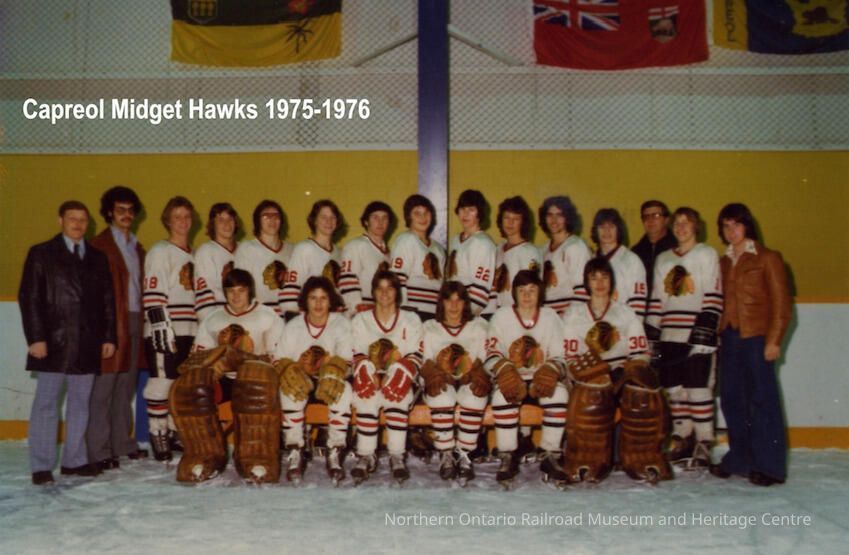 Photograph, 1975-1976 Capreol Midget Hawks. Blake Goulet, Tom Anderson, Don Austin, Tom Marquis, Dean Chokan, Wayne Mohns, Larry Lambovitch, Tony Dotto, Perry Colasimone, Robin Chuipka, Allen Melville, Killes Moreau, Phillip Butler, Mike Brownrigg, Claude Roy, Steve Kasper, Bryne Bowness.Collection