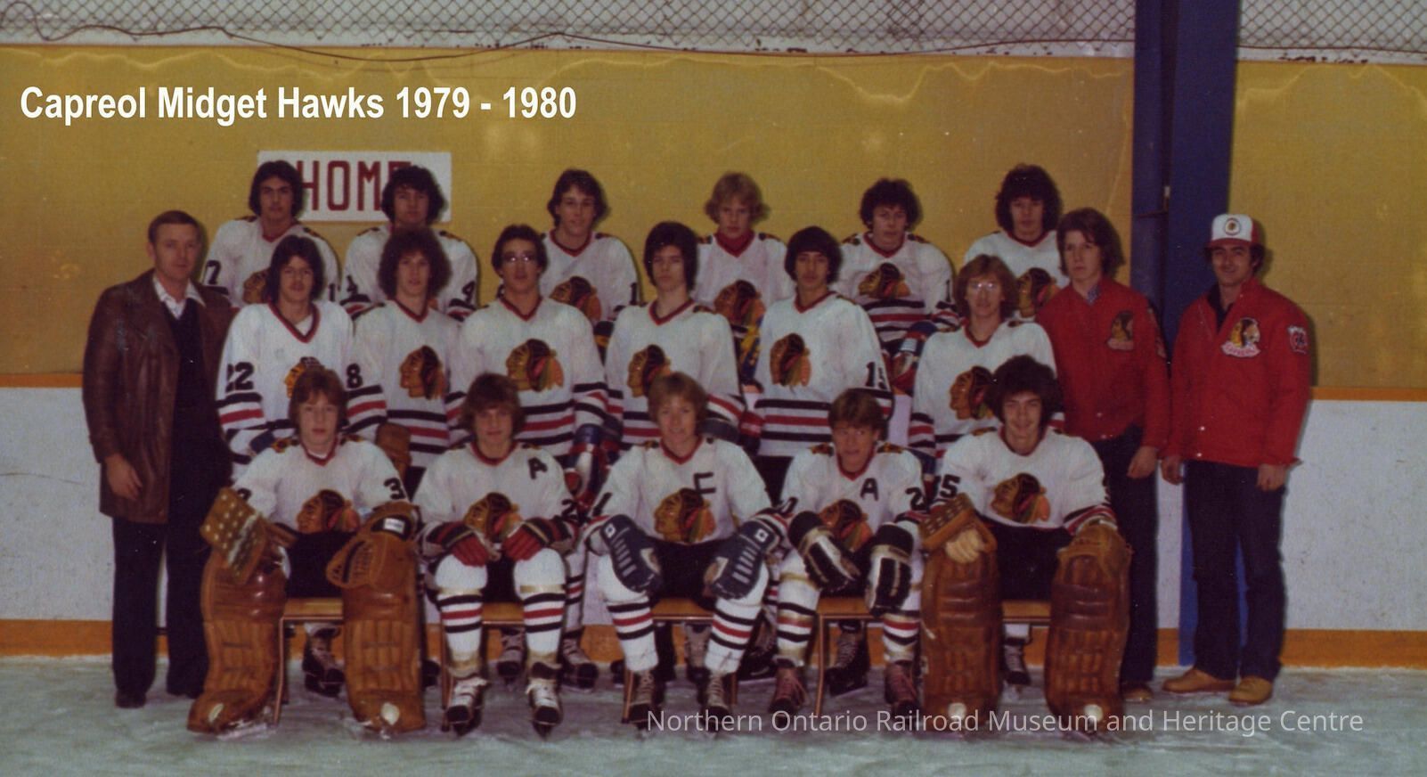 Photograph, 1979 -1980 Capreol Midget Hawks. Greg Tolenko, Jacque Legault, Mark Bonin, Mike Bolsvenue, Tim Burns, Robert Brownridge, Andy Boudreau, Jeff Fennerty, Robert McGowan, Norm Duguay, David Irving, Harvey Dasti, Robert Gagne, Peter-John McKinnon, David Thompson, Scott Wood, Phil Higgins, Peter Arsenault, Manager Don Fenerty, Coach Andy Boudreau.Collection