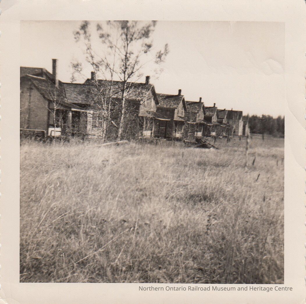Black and White- A row of abandoned, similar looking houses stand in the former town of Sellwood. Tall grass and cattails encroach on them. In front is a tree.Collection
