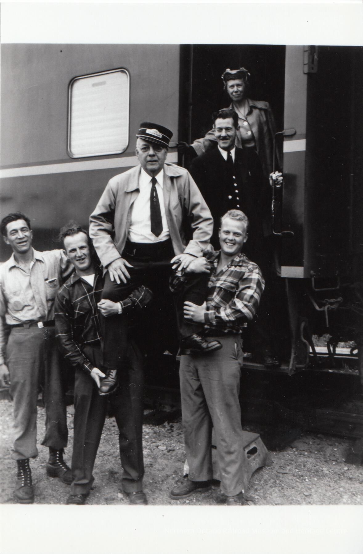 Black and White- Adam Sweezey, wearing a conductor's hat, is lifted by his sons after his run. Behind him, a man and a woman stand in the door of a train car.Collection