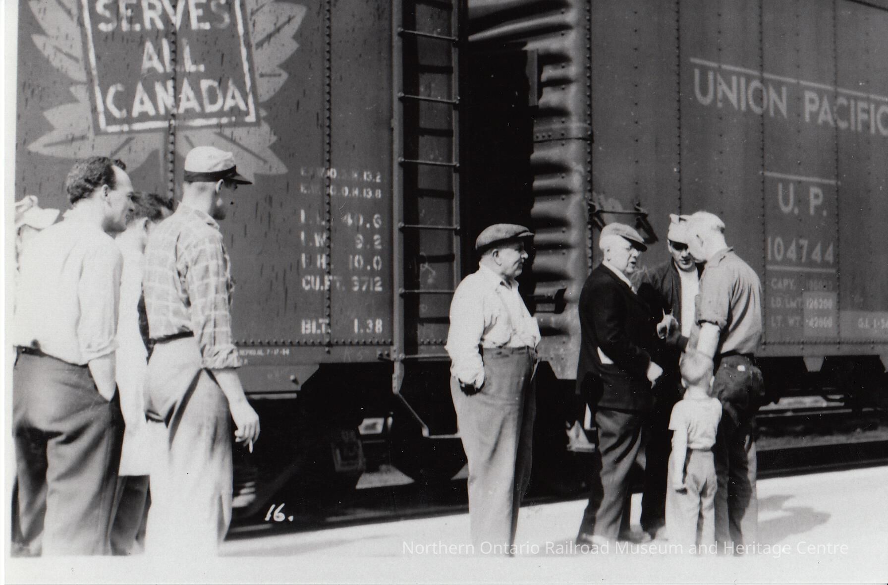 Black and White- Adam Sweezey speaks to some men in front of a CN car and a Union Pacific car.Collection