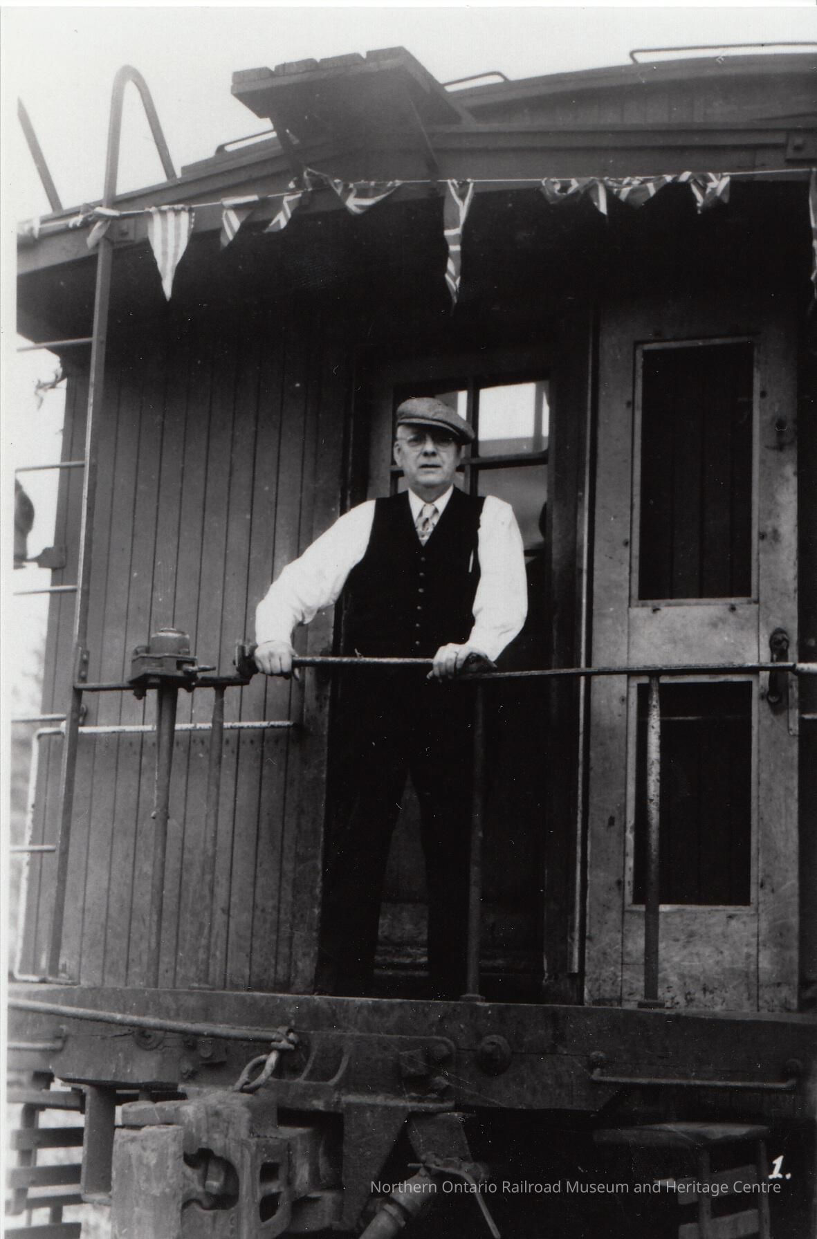 Black and White- Adam Sweezey stands on the back of a caboose, posing for a photograph, during his final run.Collection