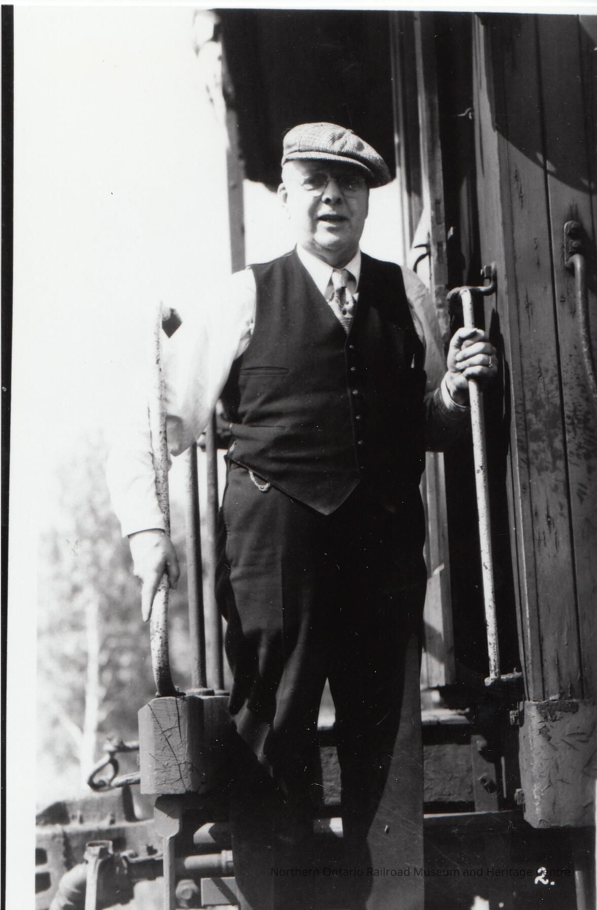 Black and White- Addie Sweezey poses for a photograph on the back of a caboose, standing on the stairs, wearing a hat, during his final run.Collection