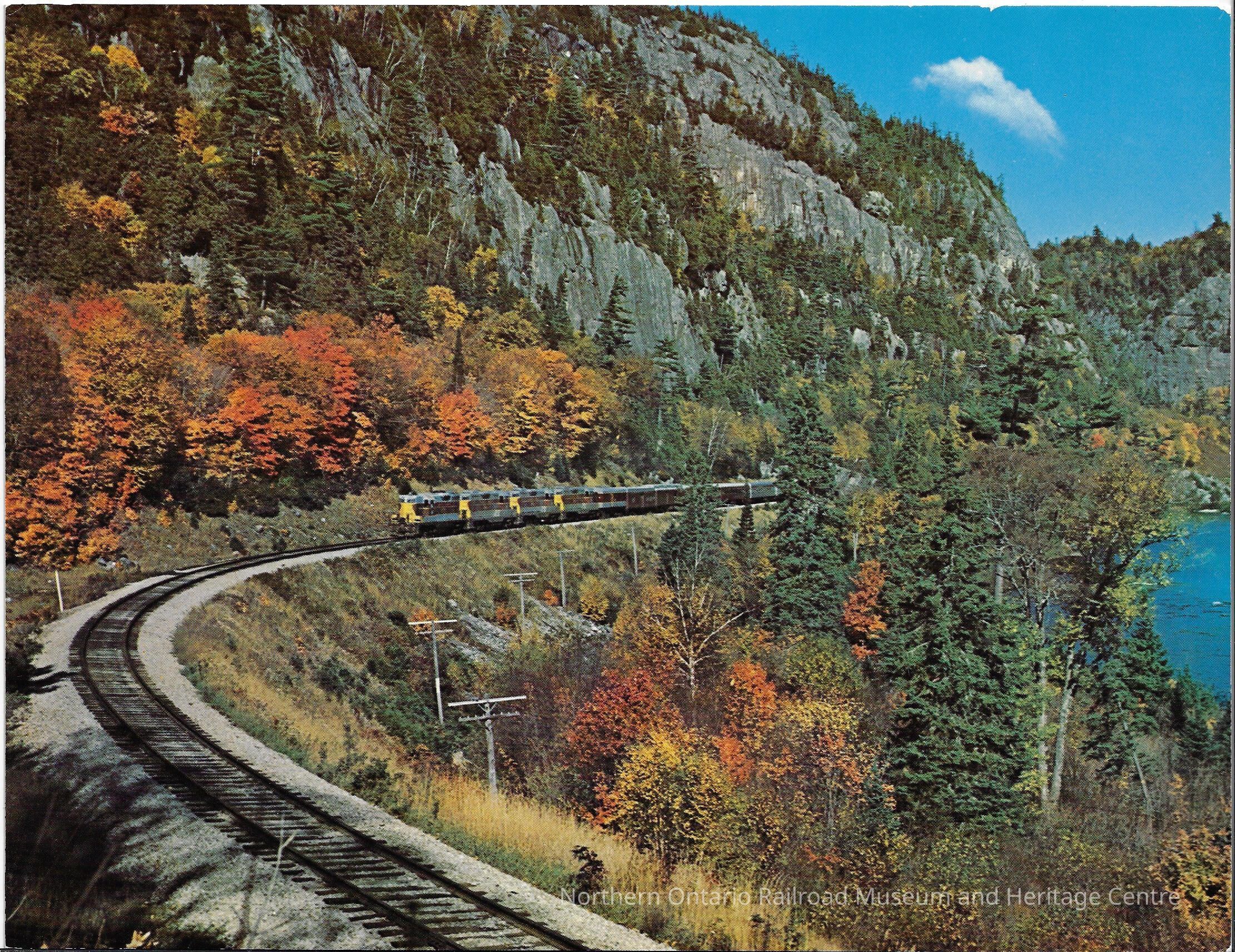 Coloured photograph of the Algoma Central's Agawa tour train on the way to the Agawa Canyon. The train is coming round a curve. It appears to be sometime in the fall as the leaves on the trees are changing colours.