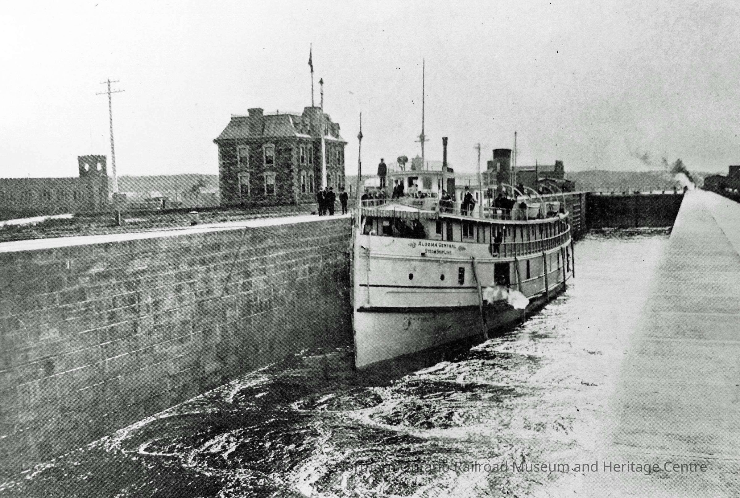 Black and white photograph of a ship from the Algoma Central Steamship Line traveling through Canadian locks. The water level is low. There is a brick house in the background. A small group of men stand on shore beside the ship.
