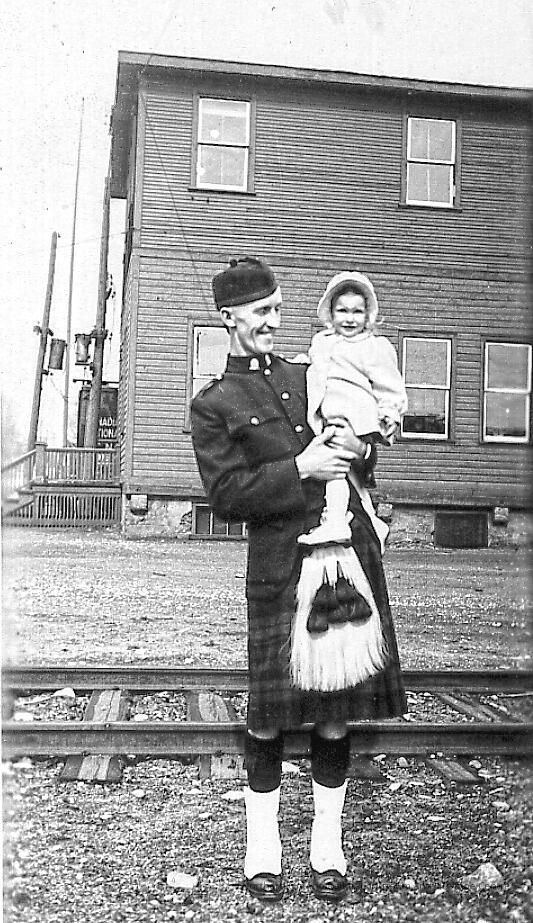 Digital reproduction of a black and white photograph of Angus McKay holding his young daughter, Elizabeth. Angus is wearing a kilt and standing beside railroad tracks in front of a building. A Canadian National boxcar can be seen to the left of the building.