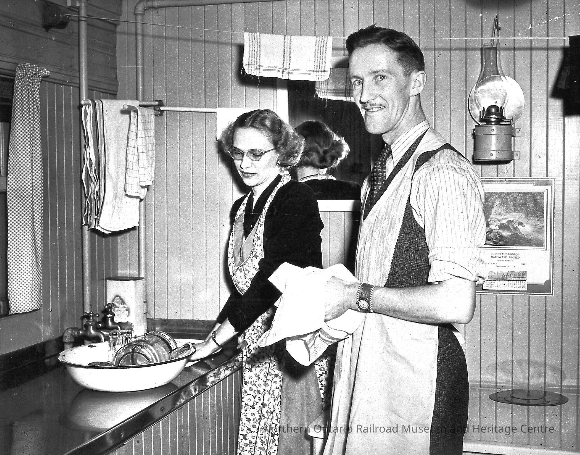 Digital reproduction of a black and white photograph of Angus and Helen McKay doing dishes on the Temiskaming and Northern Ontario school car. Angus is holding a dish towel to the right of Helen, who is standing with her hands in the sink.