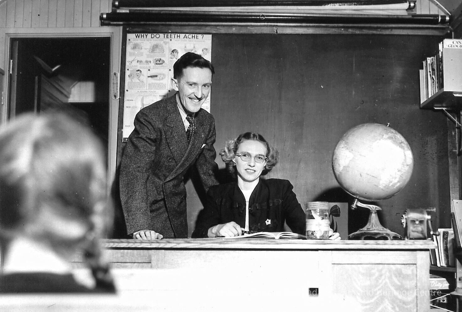 Digital reproduction of a black and white photograph of Angus and Helen McKay behind a desk on the Temiskaming and Northern Ontario school car. Angus is standing to the left of Helen, who is seated behind the desk. A globe sits on the right corner of the desk.