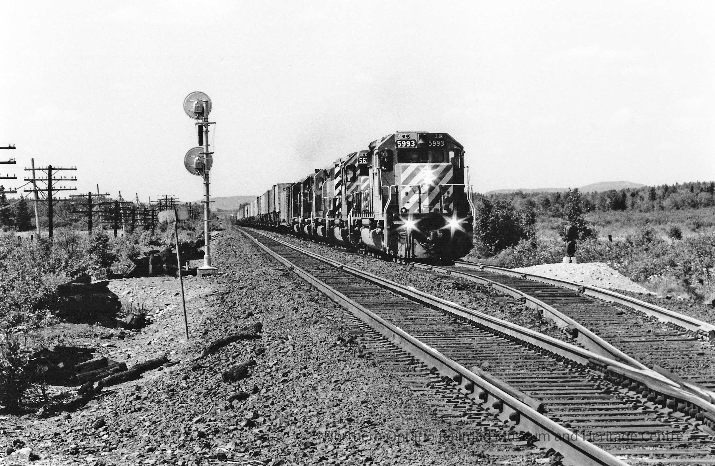 Black and white photograph of a freight train with several locomotives -- no. 5993 at the front of the train. Rayside basin in the background.Collection