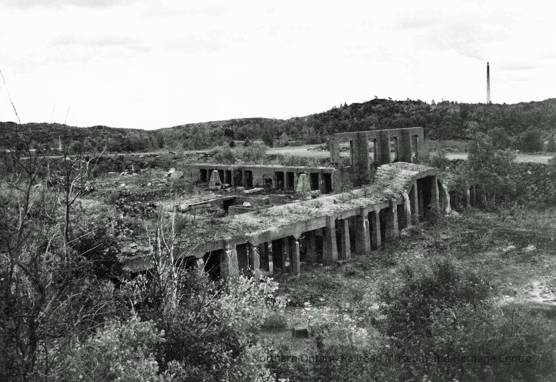 Black and white photograph of an the ruins of the British America Nickel Corporation smelter (?). Image shows a low structure on top of a small hill, surrounded by birch trees, shrubs and rocks. Image is taken from above, overlooking the square shape of the structure.Collection
