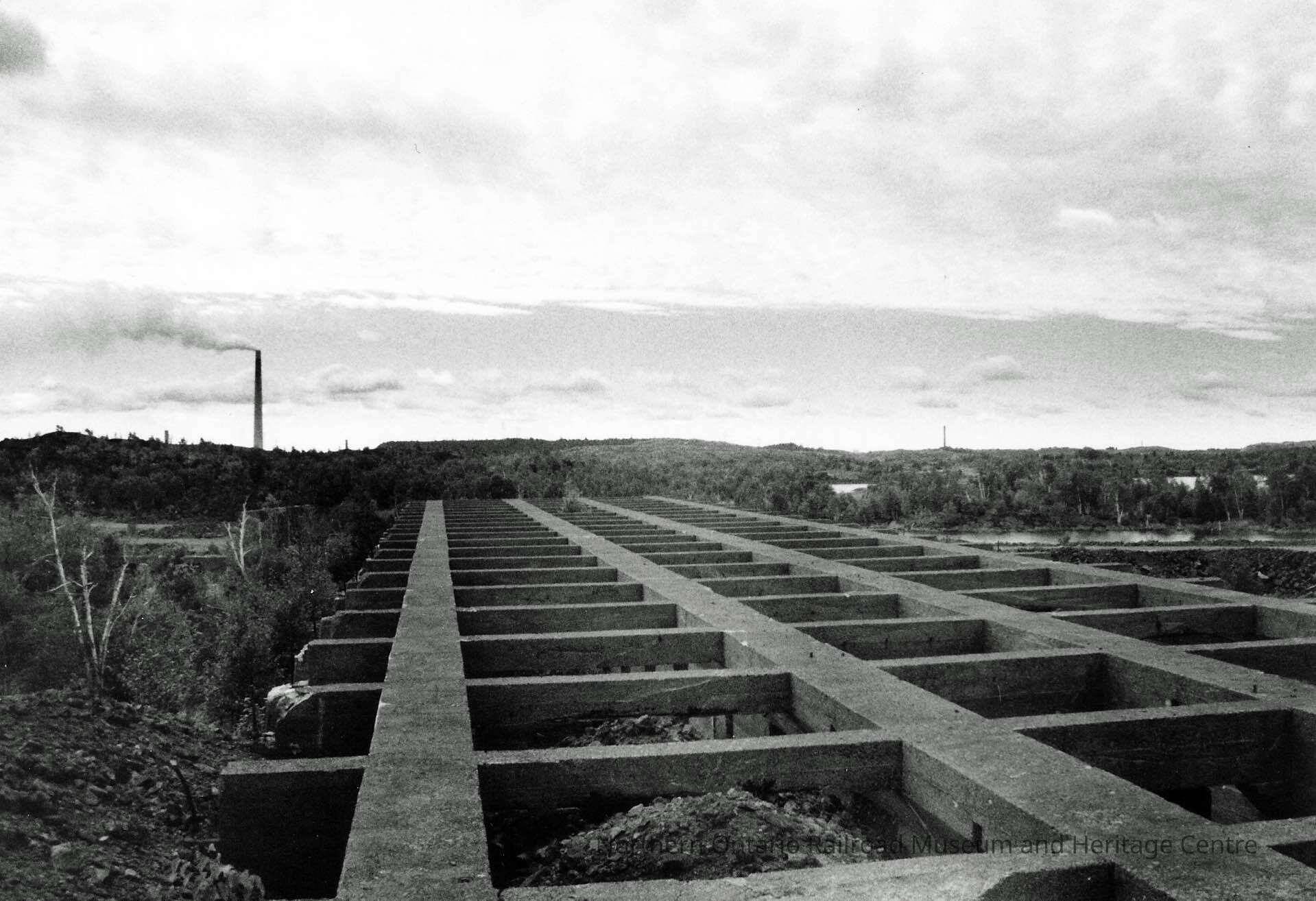 Black and white photograph of an the ruins of the British America Nickel Corporation smelter (?). Image shows a crisscross formation of beams (foundation?). Smoke stack in the distance.Collection