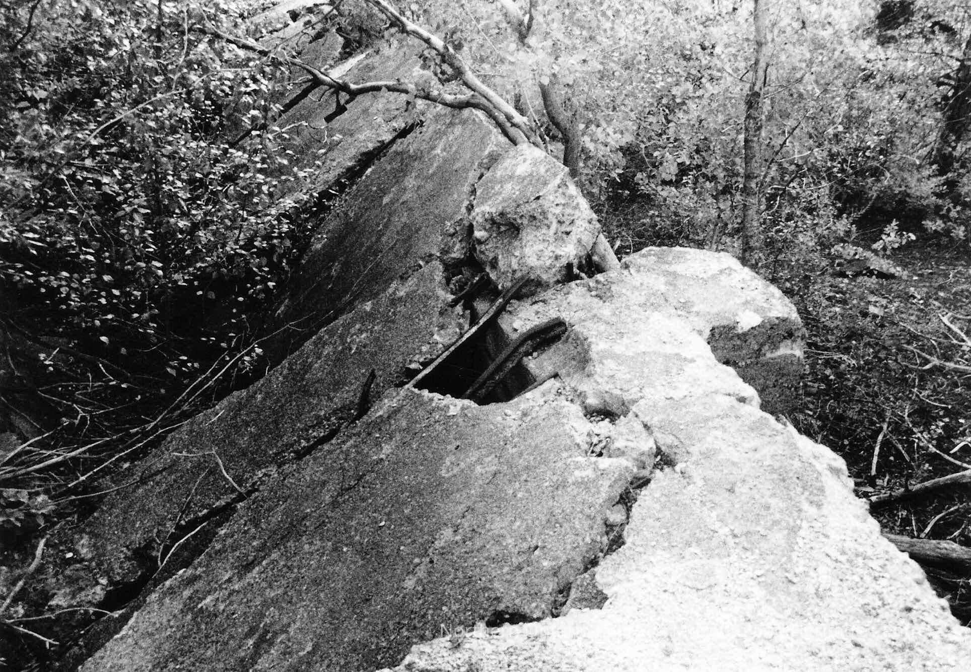 Black and white photograph of an the ruins of the British America Nickel Corporation smelter (?). Image shows a close-up of stone and rebar, surrounded by trees.Collection