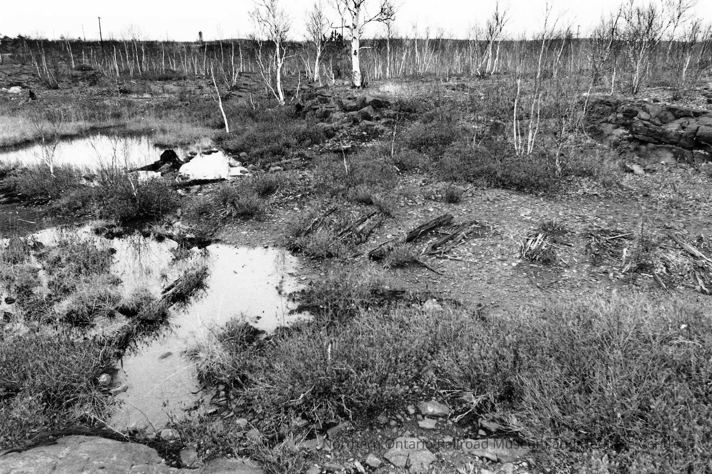Black and white photograph of the area that used to be the Blezard Mine smelter and roast yard. It is now covered with brush and trees. The image shows two small pools of water to the left.Collection