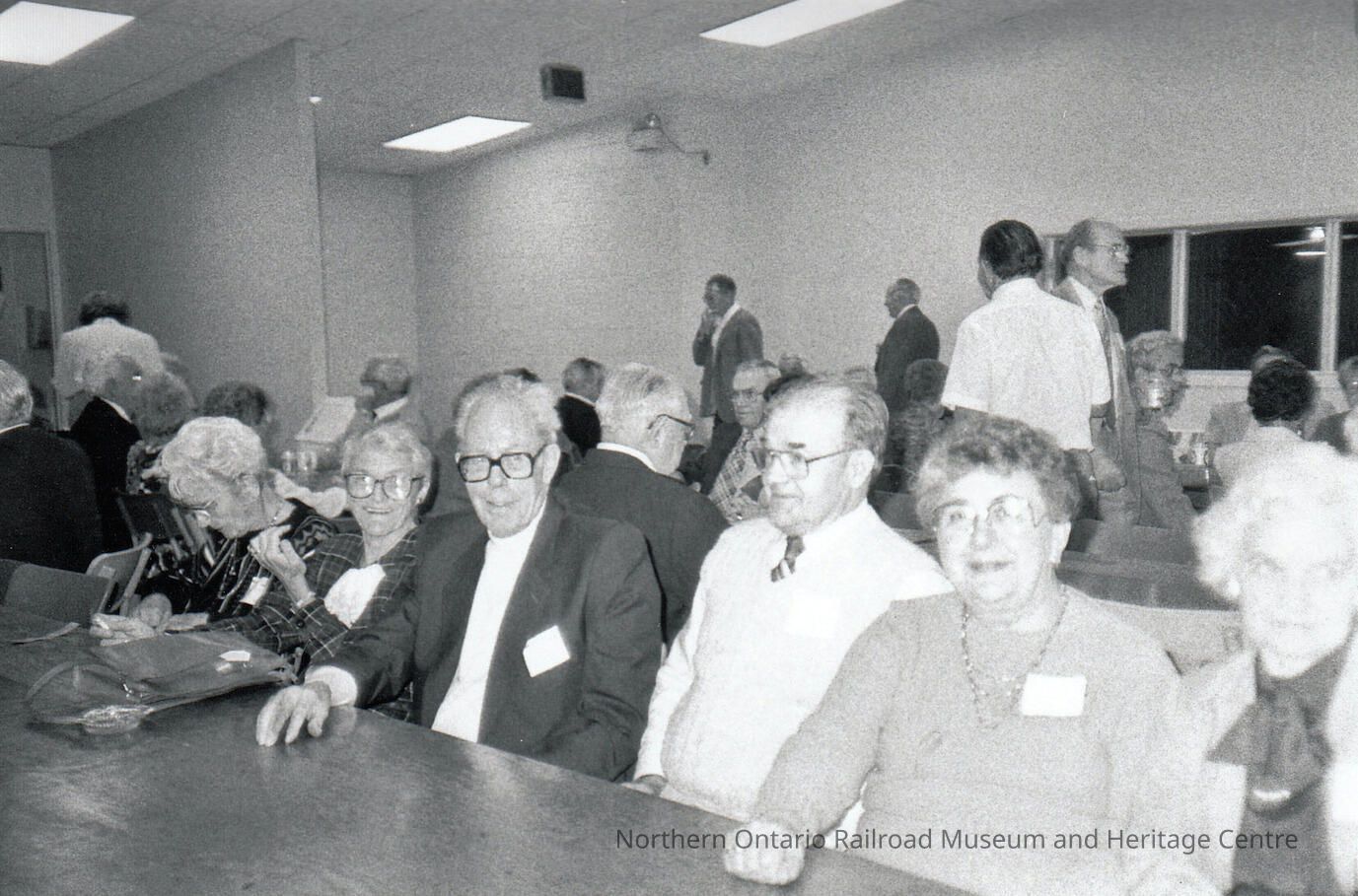 Black and white- A photograph of several people sitting at a long wooden table. Behind them are more partygoers.Collection