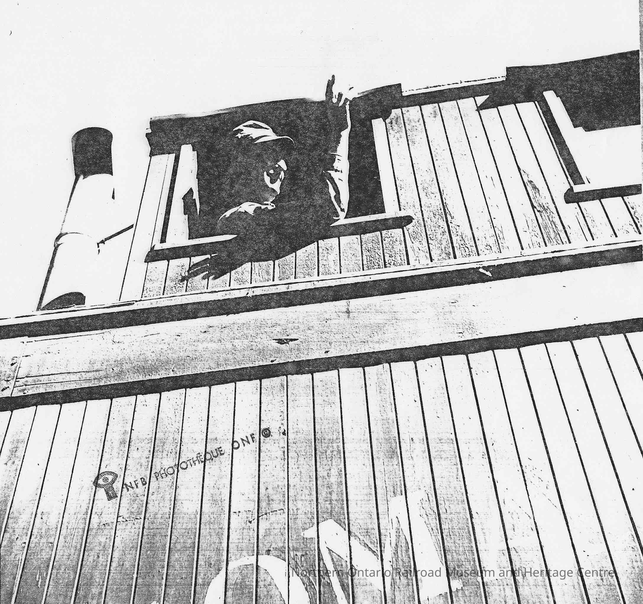 Photocopy of a photograph of brakeman F.N. Beaudet waving from cupola window of the caboose as the train pulls out of Tabor, Ontario.