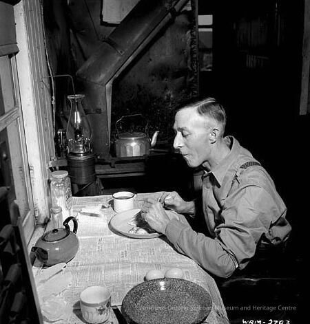 Photograph, Brakeman F.W. Gibson eats breakfast at three a.m. in a caboose with another railwayman.Collection