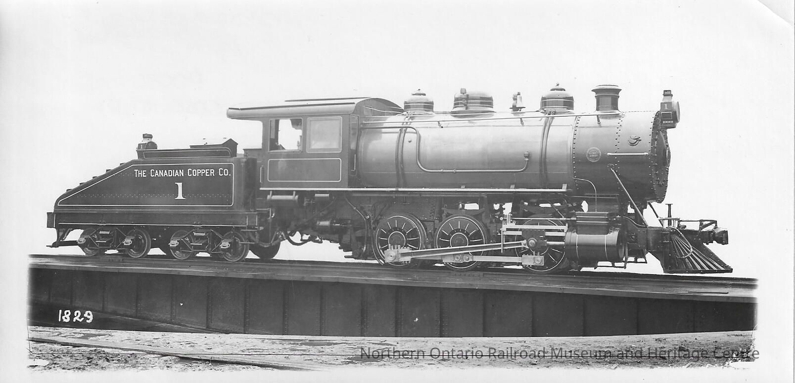 Black and white photograph showing the right side of Canadian Copper Company Locomotive #1. The tender is also visible. The locomotive appears to be either on a bridge or turntablePhotograph Details