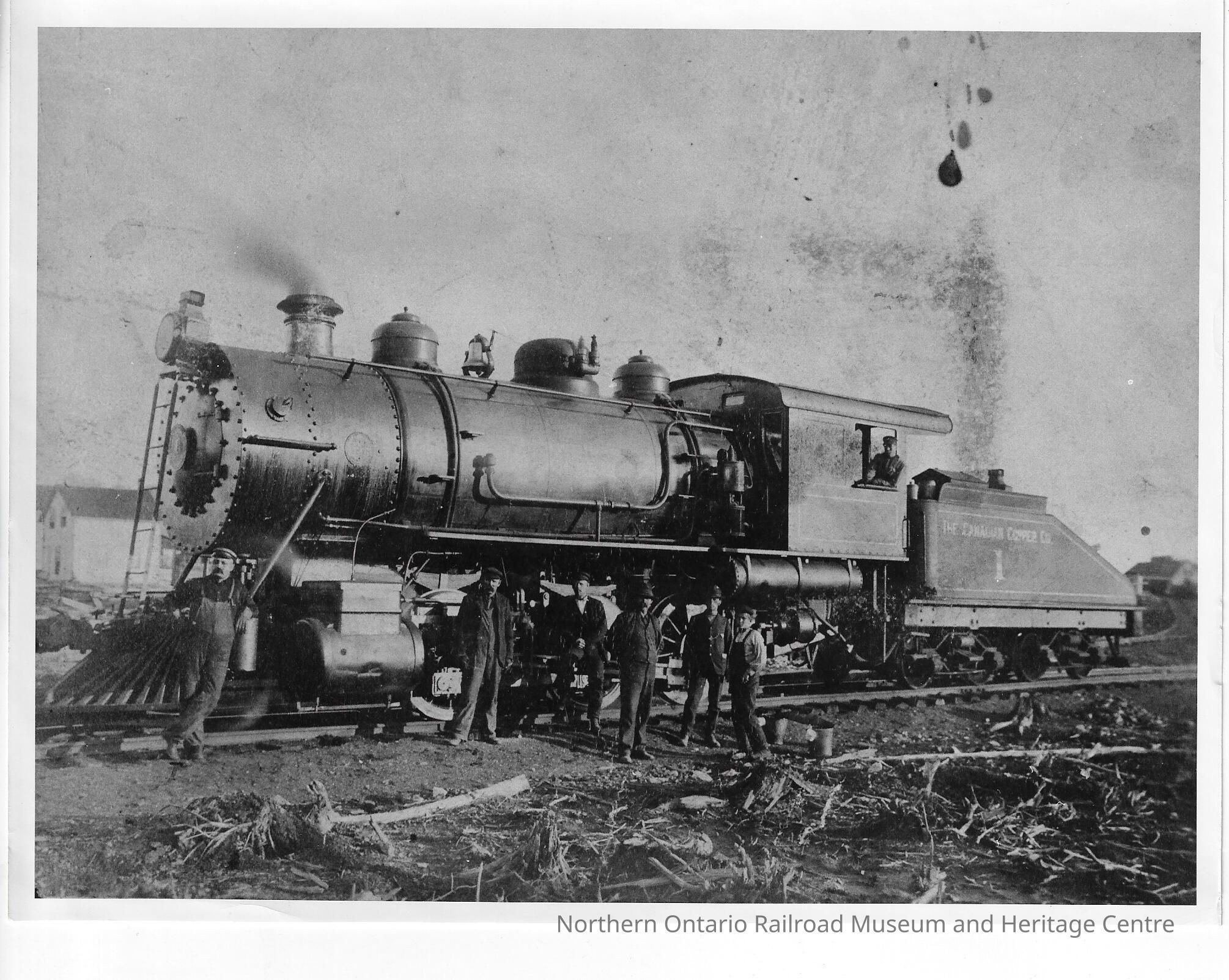 Black and white photograph showing Canadian Copper Company's locomotive #1. The photo shows the left side and partial view of the front of the locomotive, the tender is visible.Photograph Details