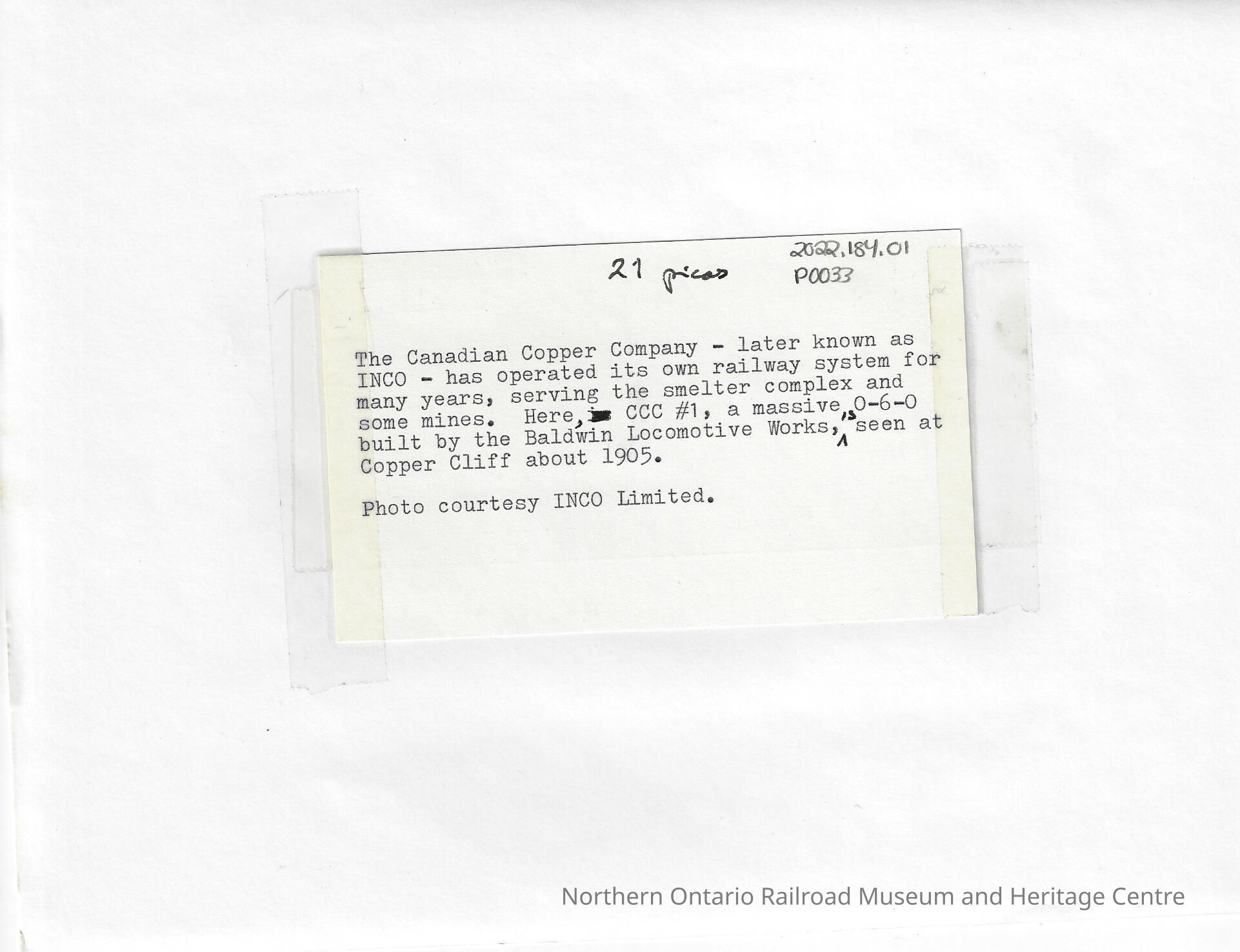 "The Canadian Copper Company - later known as INCO - has operated its own railway system for many years, serving the smelter complex and some mines. Here, CCC#1, a massive 0-6-0 built by the Baldwin Locomotive Works, ^ is seen at Copper Cliff about 1905.