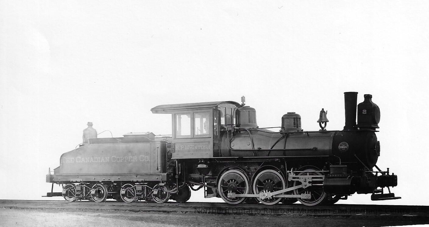 Black and white photograph showing Canadian Copper Company Locomotive #2. The photo shows the right side and partial front of the locomotive. The tender is visible and there is a man standing in it.Photograph Details