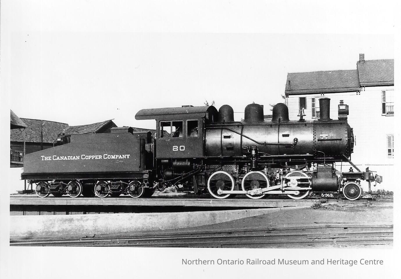 Black and white photograph showing Canadian Copper Company locomotive #20 and tender. The photo shows the right side of the locomotive, the tender is visible. It appears to be on a turntable or bridge.Photograph Details