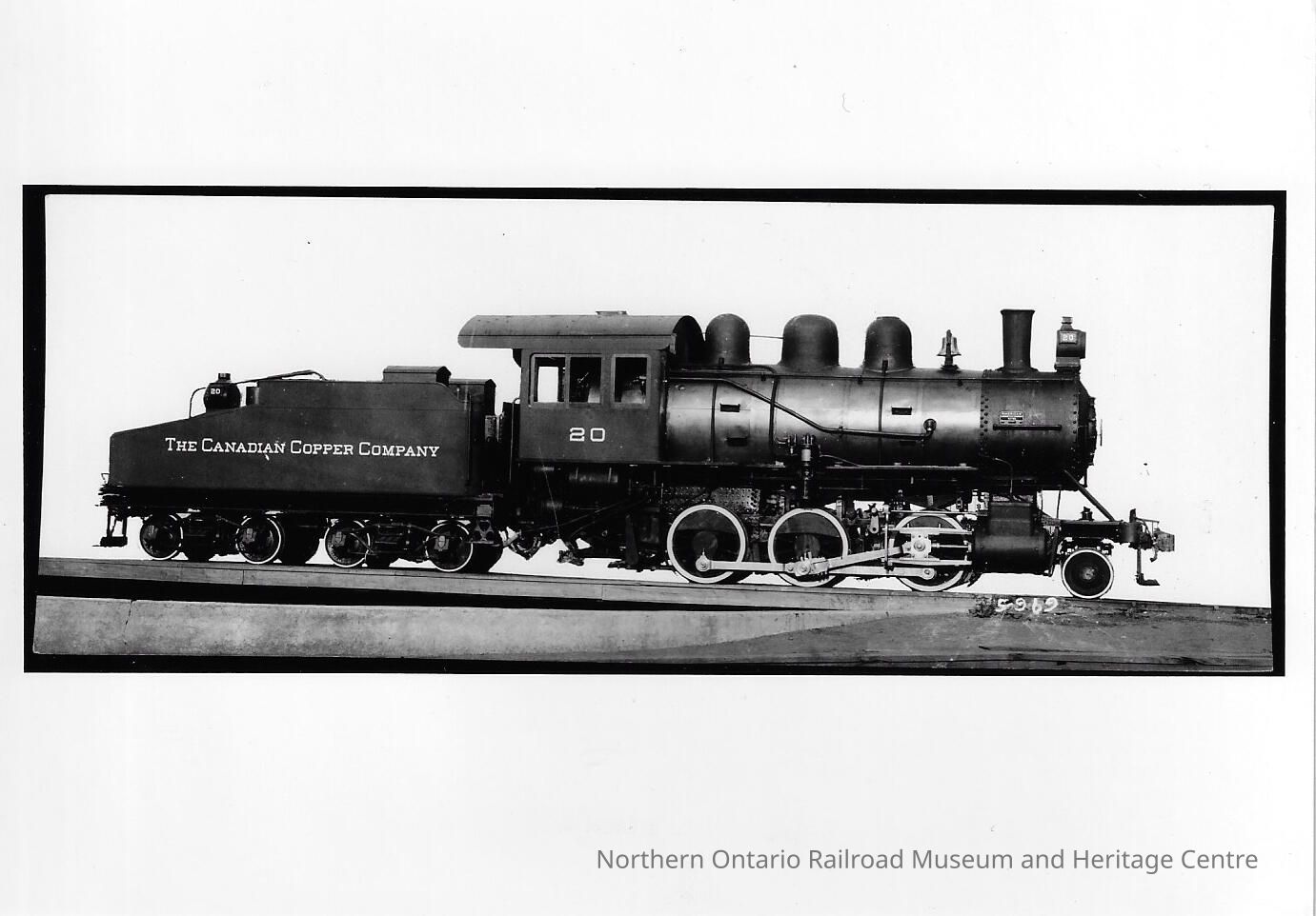 Black and white photograph showing the right side of a Canadian Copper Company steam locomotive. The photograph shows both the locomotive and tender.Photograph Details