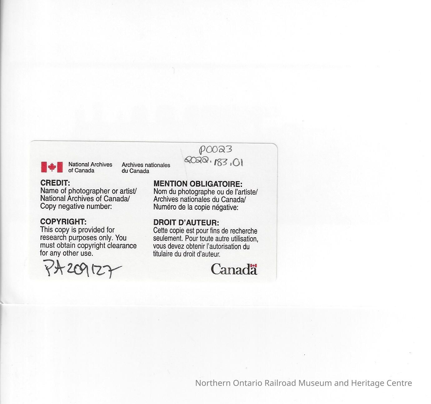 Name of photographer or artist/National Archives of Canada/Copyright Negative number: