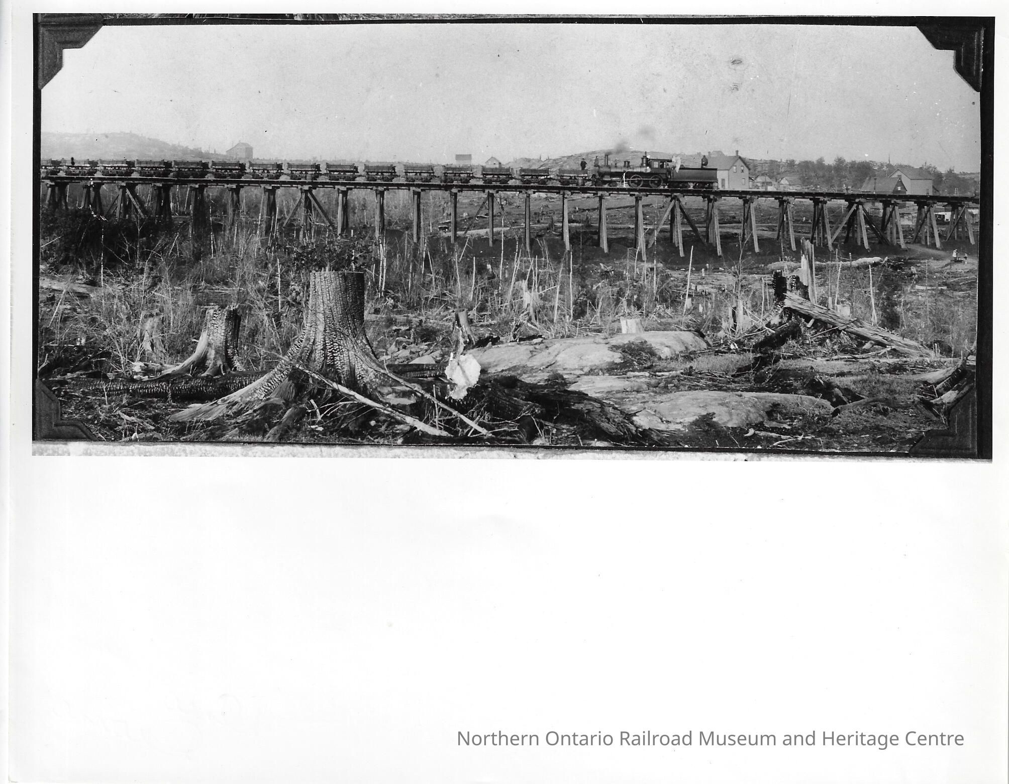 Black and white photograph showing a Canadian Copper Company ore train passing by a roast yard. The image shows the right side of the ore train as it is passing by. There are tree stumps visible in the foreground.Photograph Details