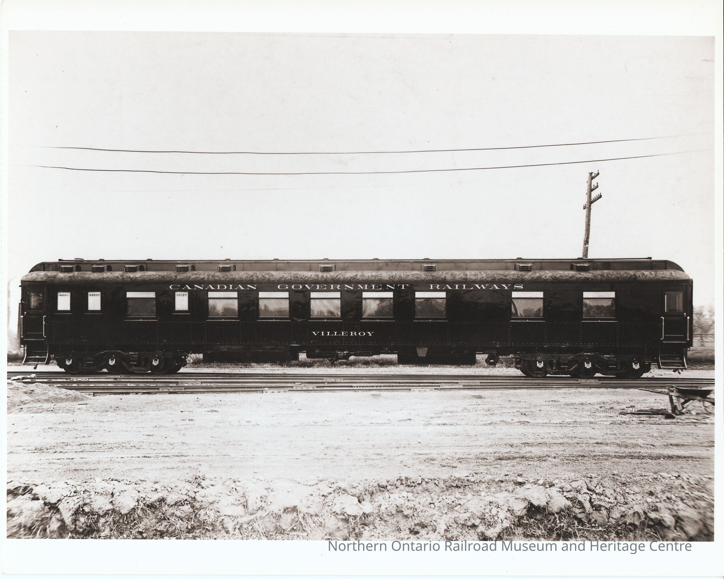 Black and white photograph of Canadian Government Railway "Villeroy" passenger car no. 1521. "VILLEROY" is stenciled on the side of the car.Collection