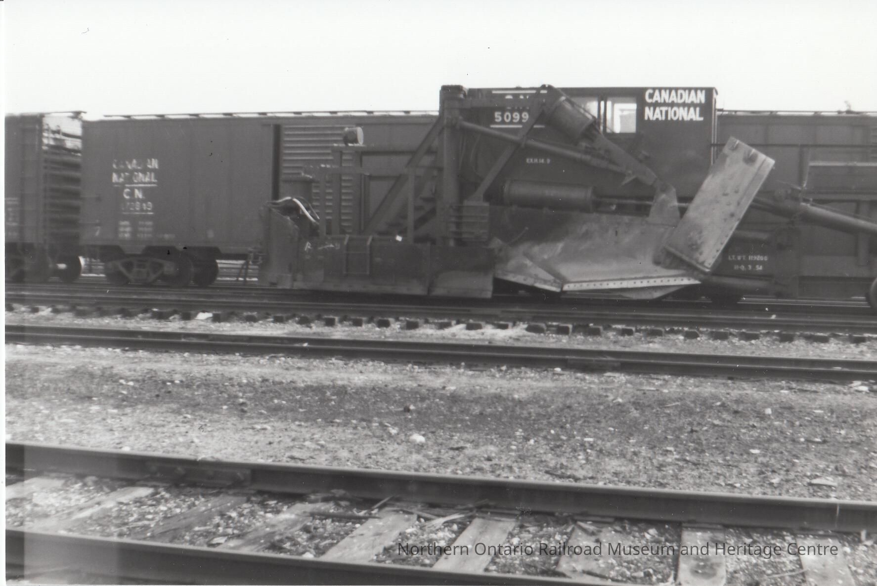 Black and white photograph of Canadian National boxcars.
