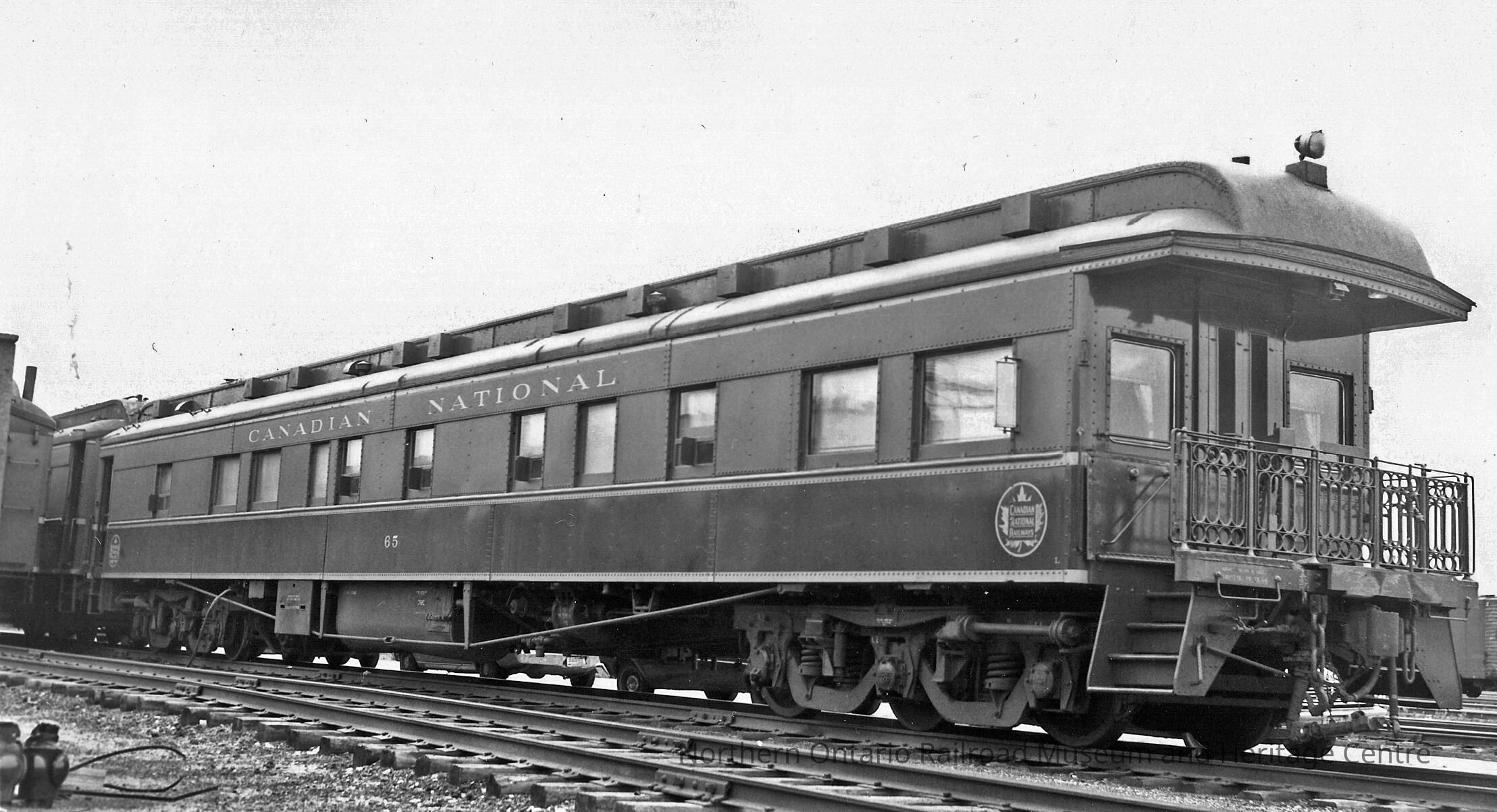 Black and white photograph of Canadian National business car no. 65 in Winnipeg, Manitoba.Collection