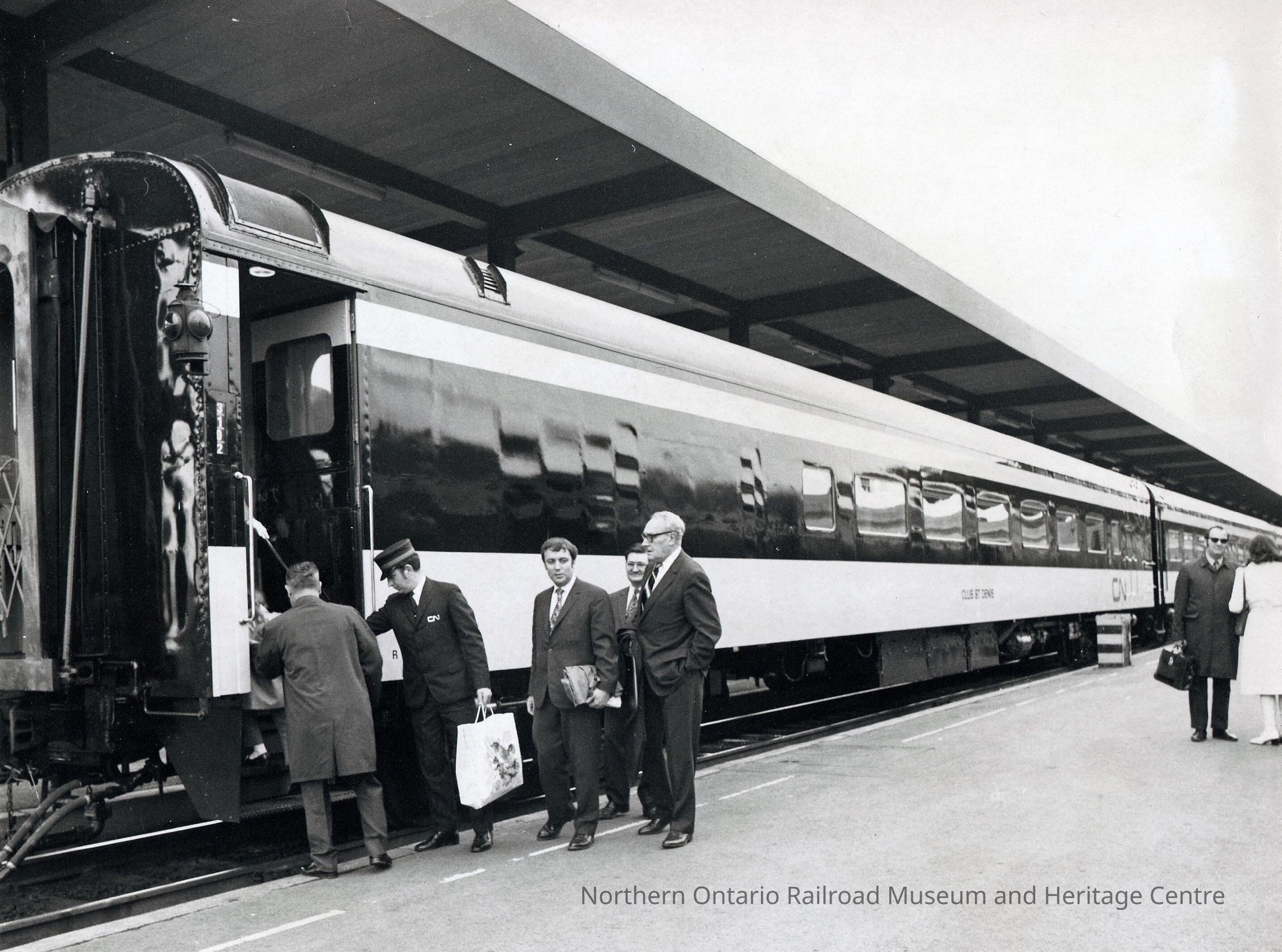 Black and white photograph of a man being helped onto a new Canadian National club car in Ottawa by a CN employee. Three men wait to board the train. The words" CLUB ST DENIS" are stenciled on the side of the car.Context