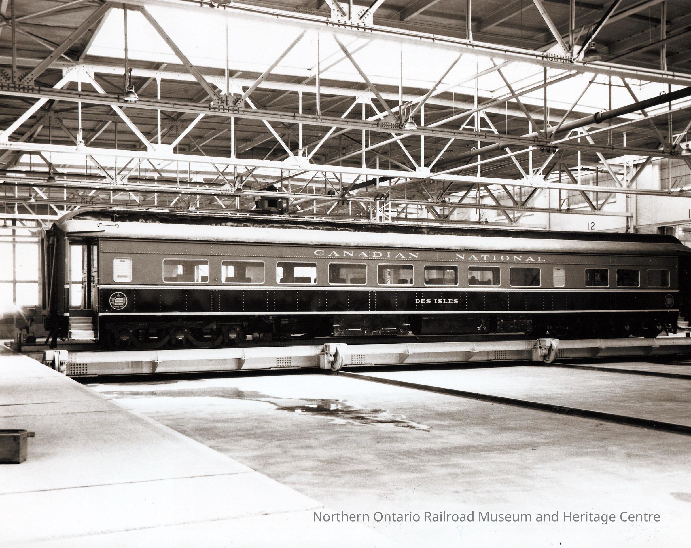 Black and white photograph of Canadian National passenger car no. 563 with the words "DES ISLES" stenciled on the side. Train is inside a station or garage.Collection